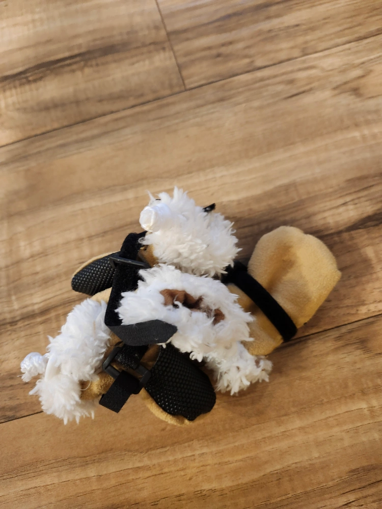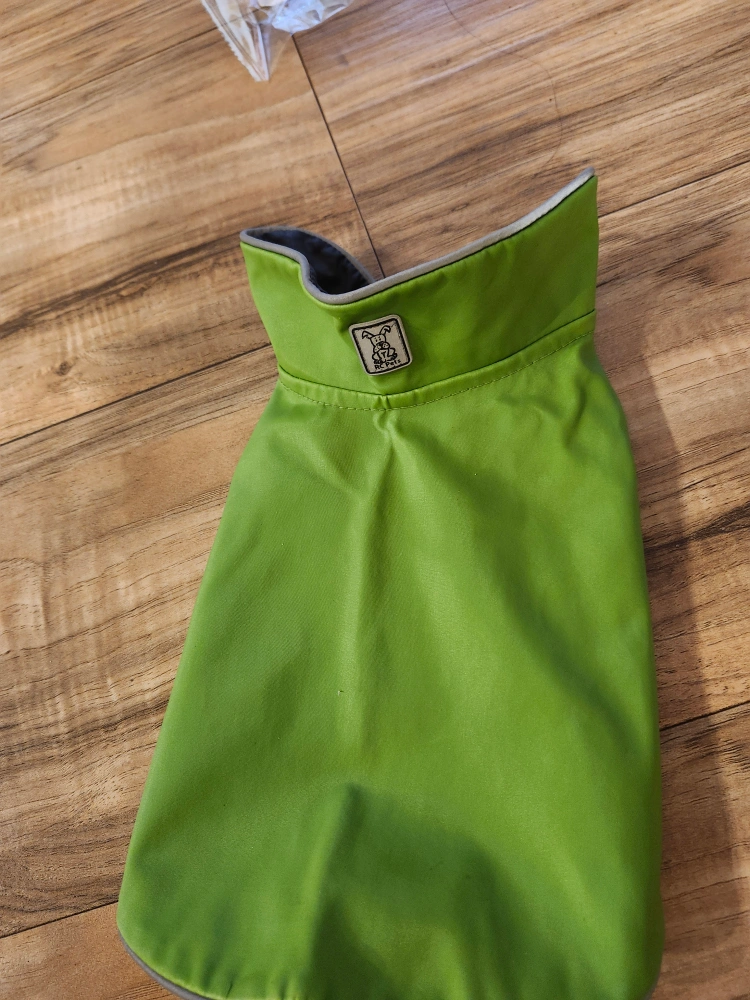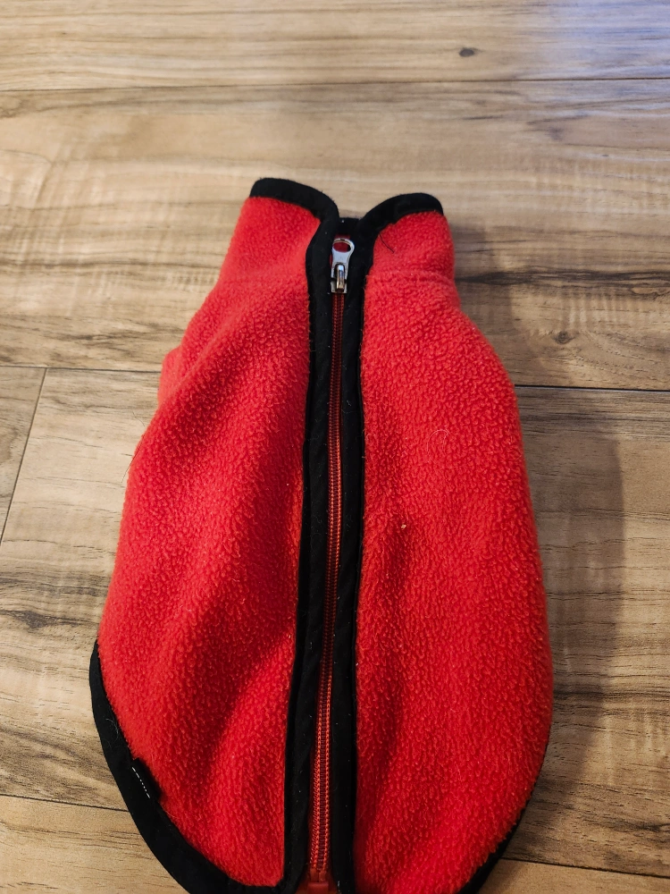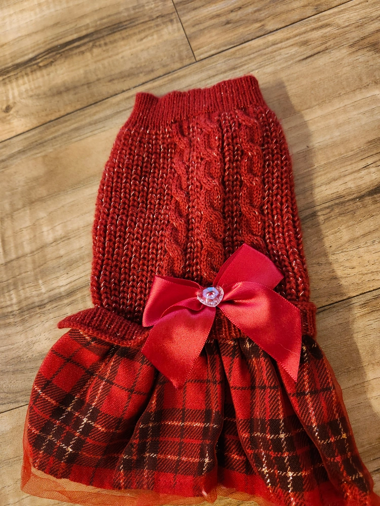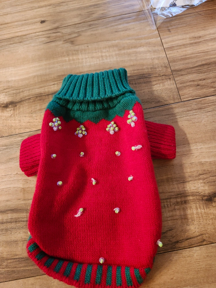 Bundle of dog clothes. One knitted sweater, one fleece jacket, one red sweater with a hood, one red sweater with a snowflake pattern, and one camouflage sweater. Bundle of harnesses. All great condition.
