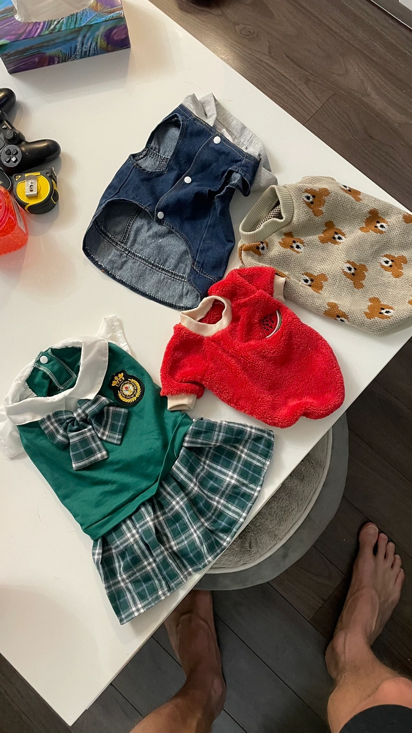 11Four dog outfits. Includes a green and white plaid skirt, a red fuzzy sweater, a blue denim vest, and a tan sweater with bear print. Size Small fits 5-10lb dogs