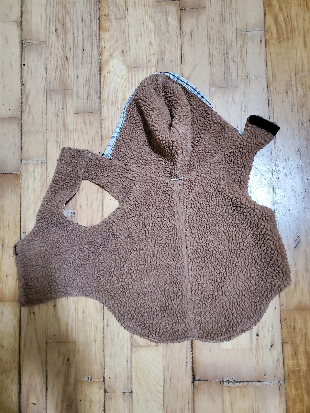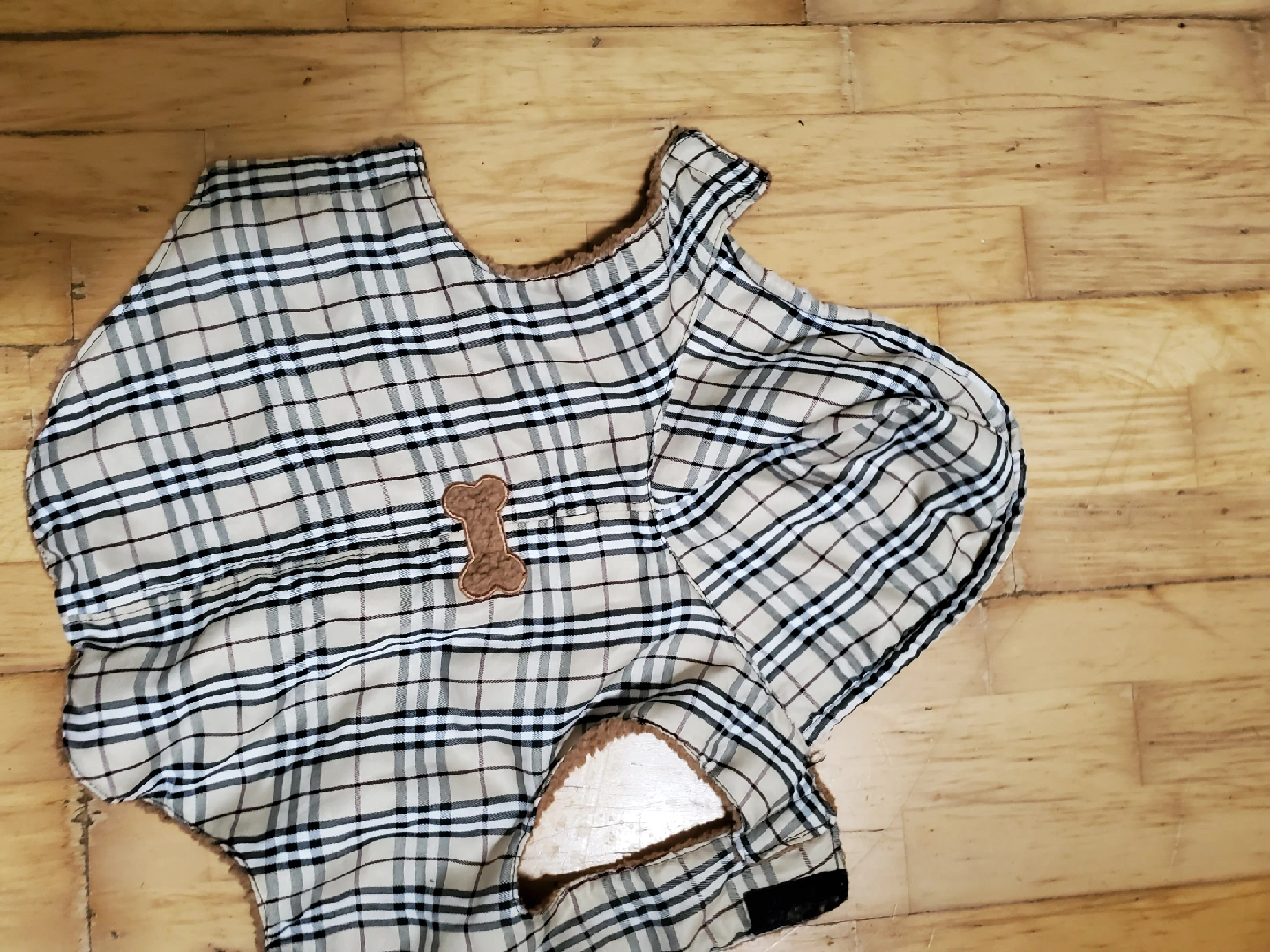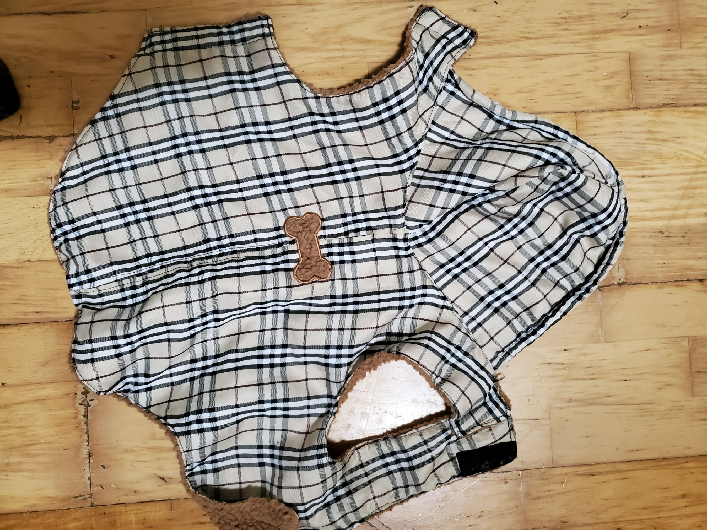 Dog coat with a brown fleece interior and a plaid exterior. It has a cute bone detail on the back! Cedar pick up.