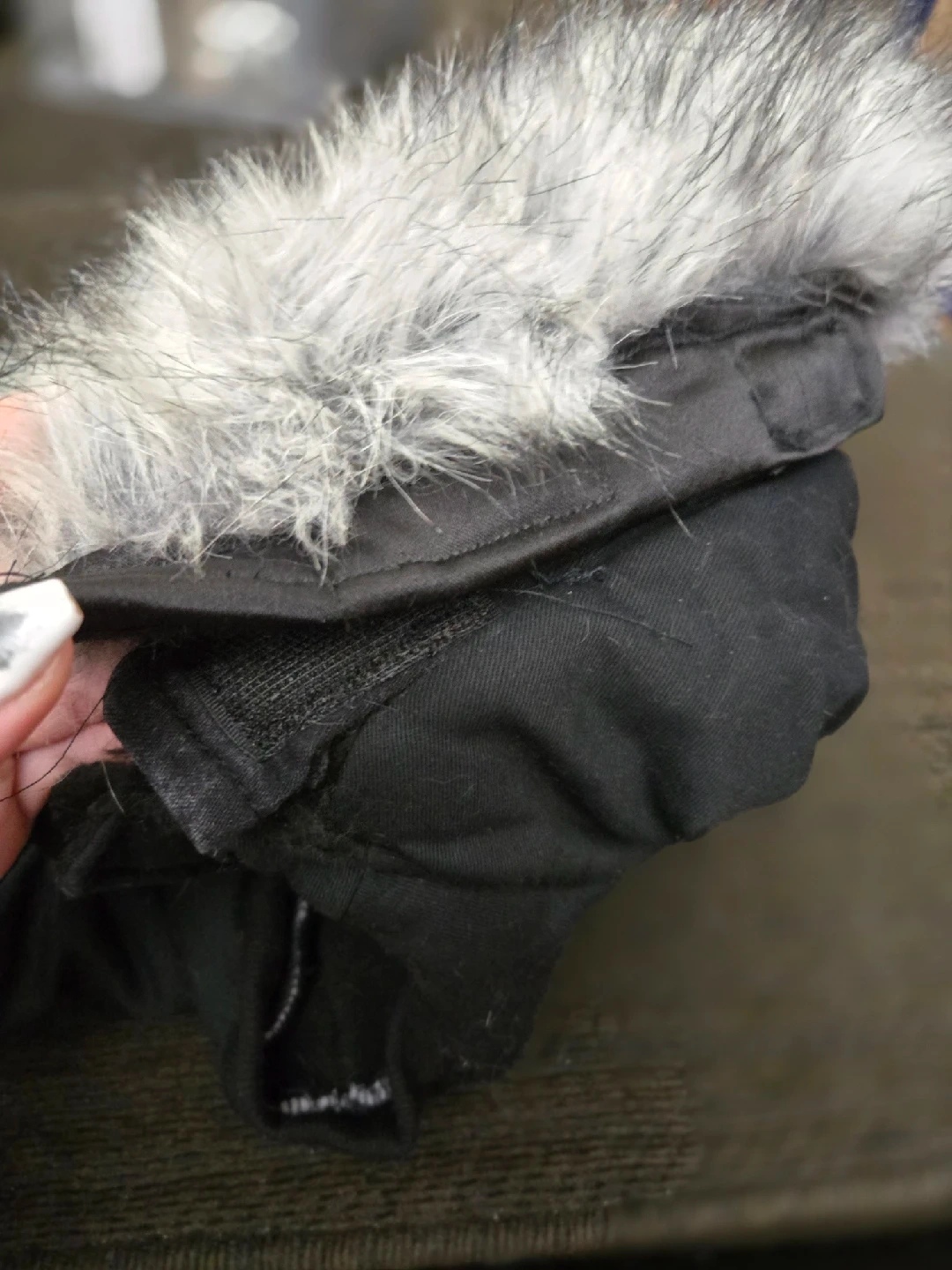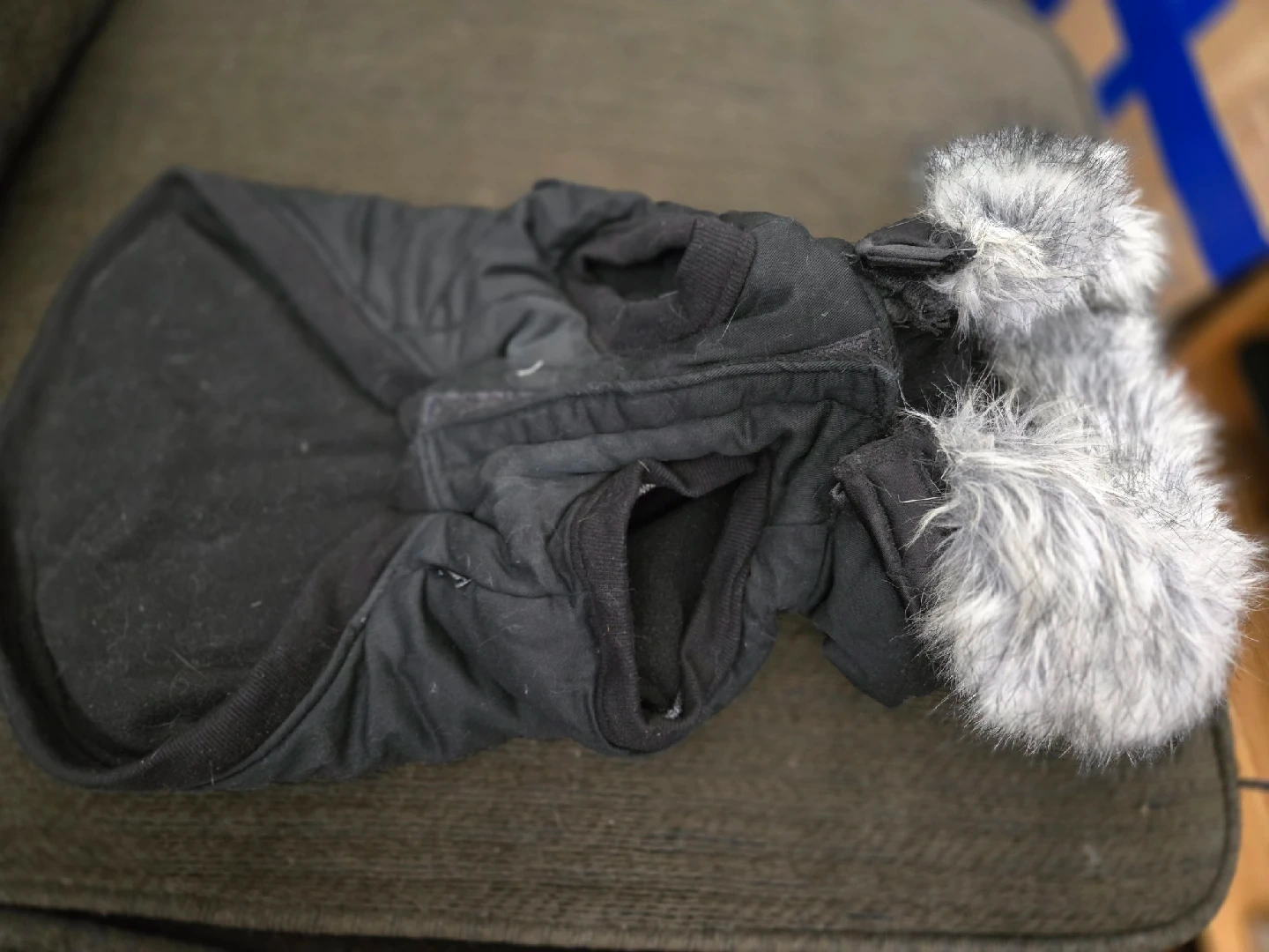 94like new black silver paw brand dog coat. I added a cozy faux fur trim to the hood that is removable with velcro. Has reflective strips also. Fleece lined size large, for a 20-25 lb dog