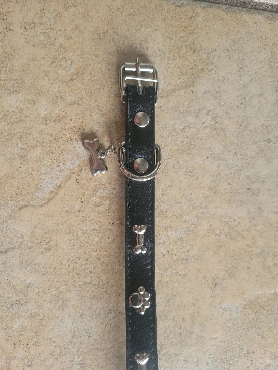 65Selling a cute black dog collar! It features adorable bone and paw print charms. A stylish accessory for your furry friend. 13.5 inches long