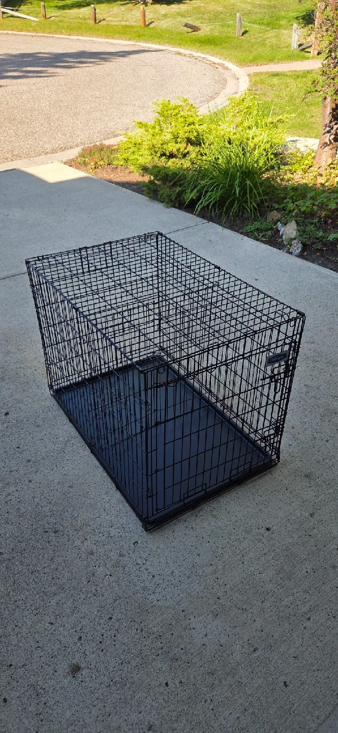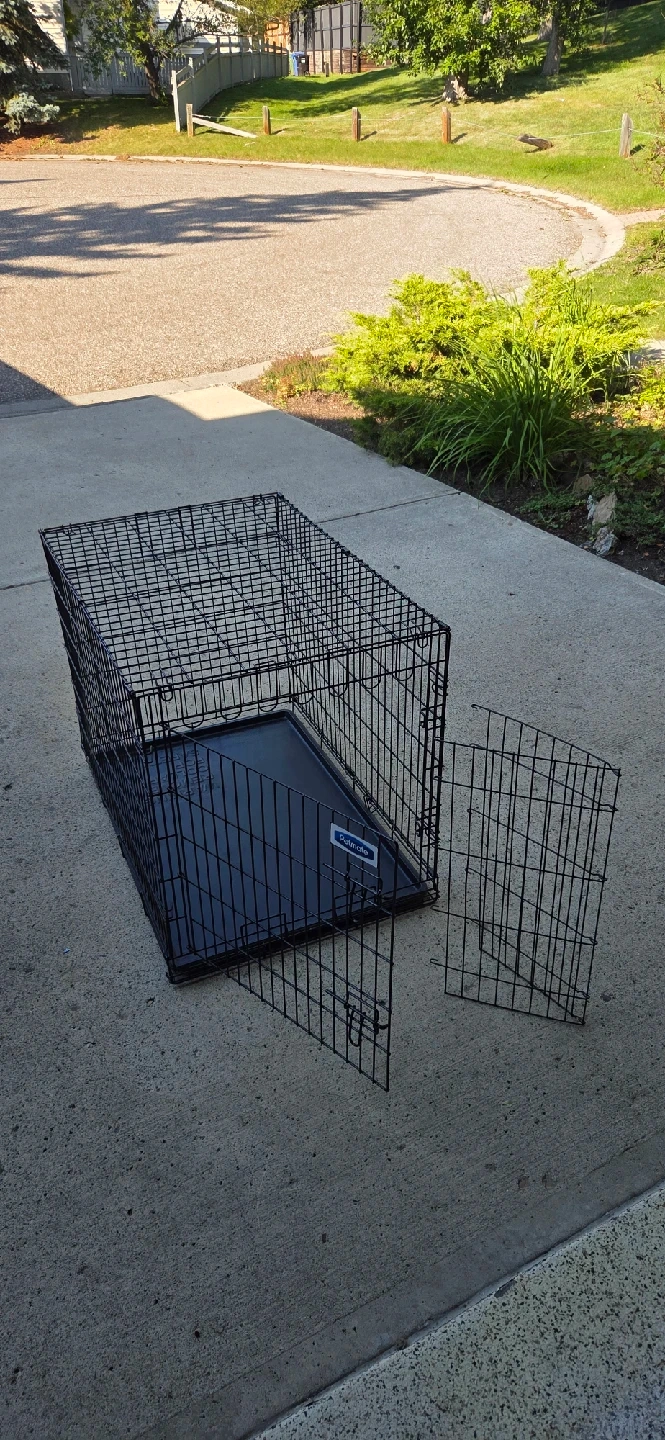 10Selling a black dog crate. It's in good condition and comes with an interior divider and a removable tray for easy cleaning. Perfect for house training or providing a safe space for your furry friend!