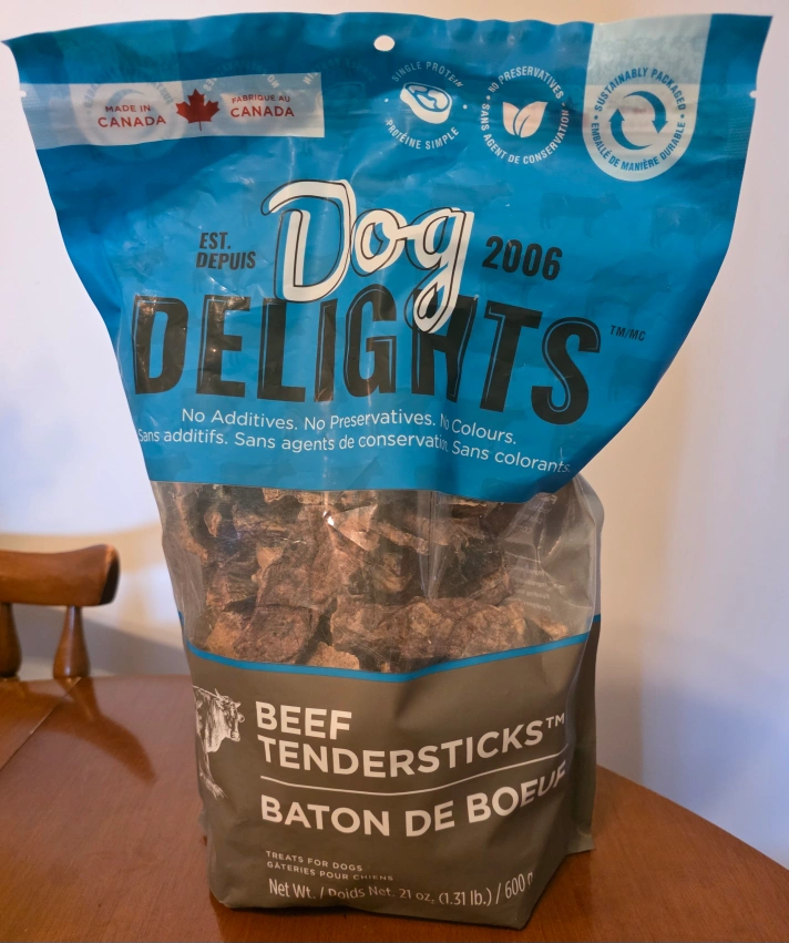 Selling a bag of Dog Delights Beef Tendersticks for your furry friend! These are treats for dogs, made in Canada. The bag contains 600g (21 oz / 1.31 lb) of beef tendersticks. No additives, no preservatives, and no colours. Expiry Date: 2027 March 17