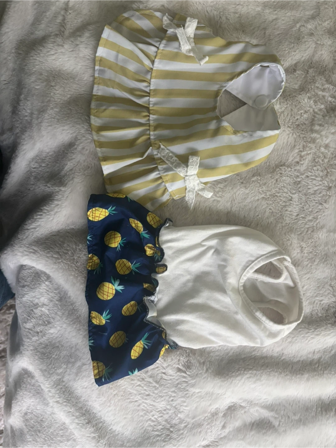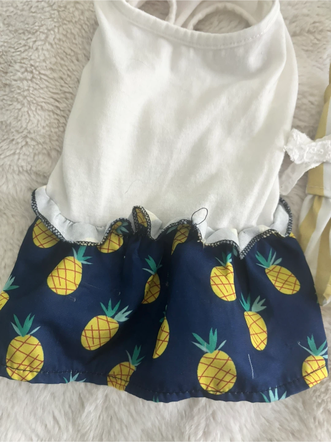 Two cute dog dresses for sale! One is a yellow and white stripe pattern with little bows, and the other is a white top with a blue pineapple print skirt. Both are in great condition and ready for your furry friend to strut their stuff! Size XS
