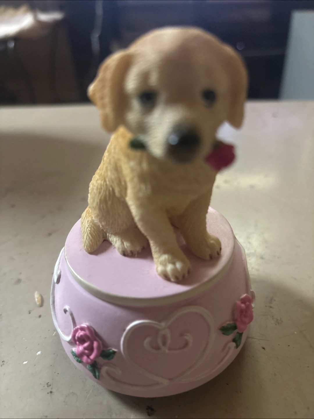 A cute dog figurine sitting on a pink base with roses and hearts. It's a charming little piece! Plays “How much is that doggy in the window?”