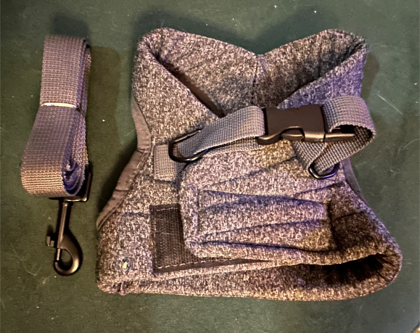 60Never used soft pet harness with a matching leash. The harness is grey and features adjustable Velcro and side buckle straps on top for a secure fit.