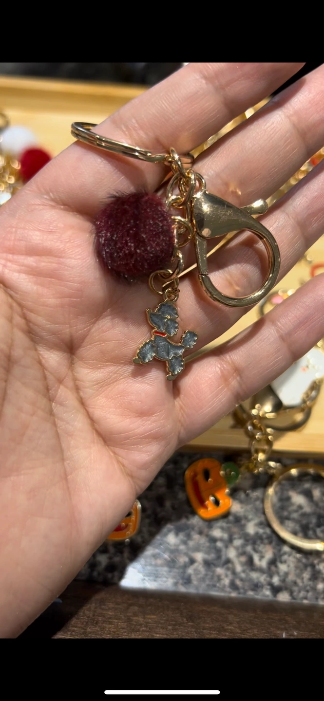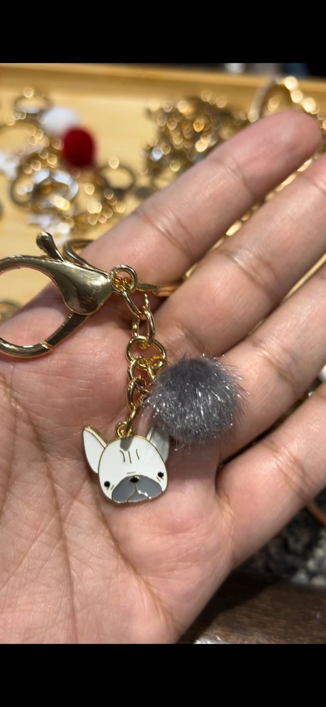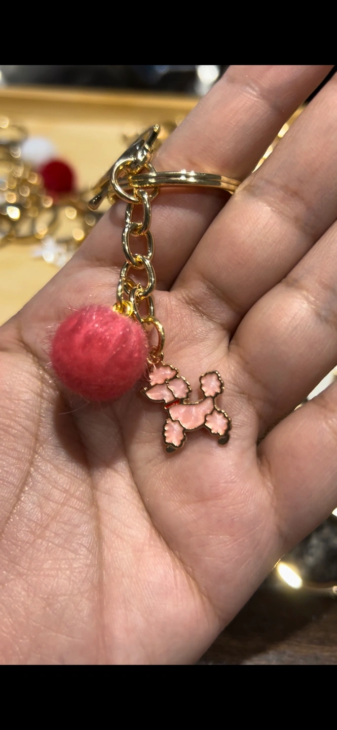 Adorable dog keychain with a fluffy pom pom charm.