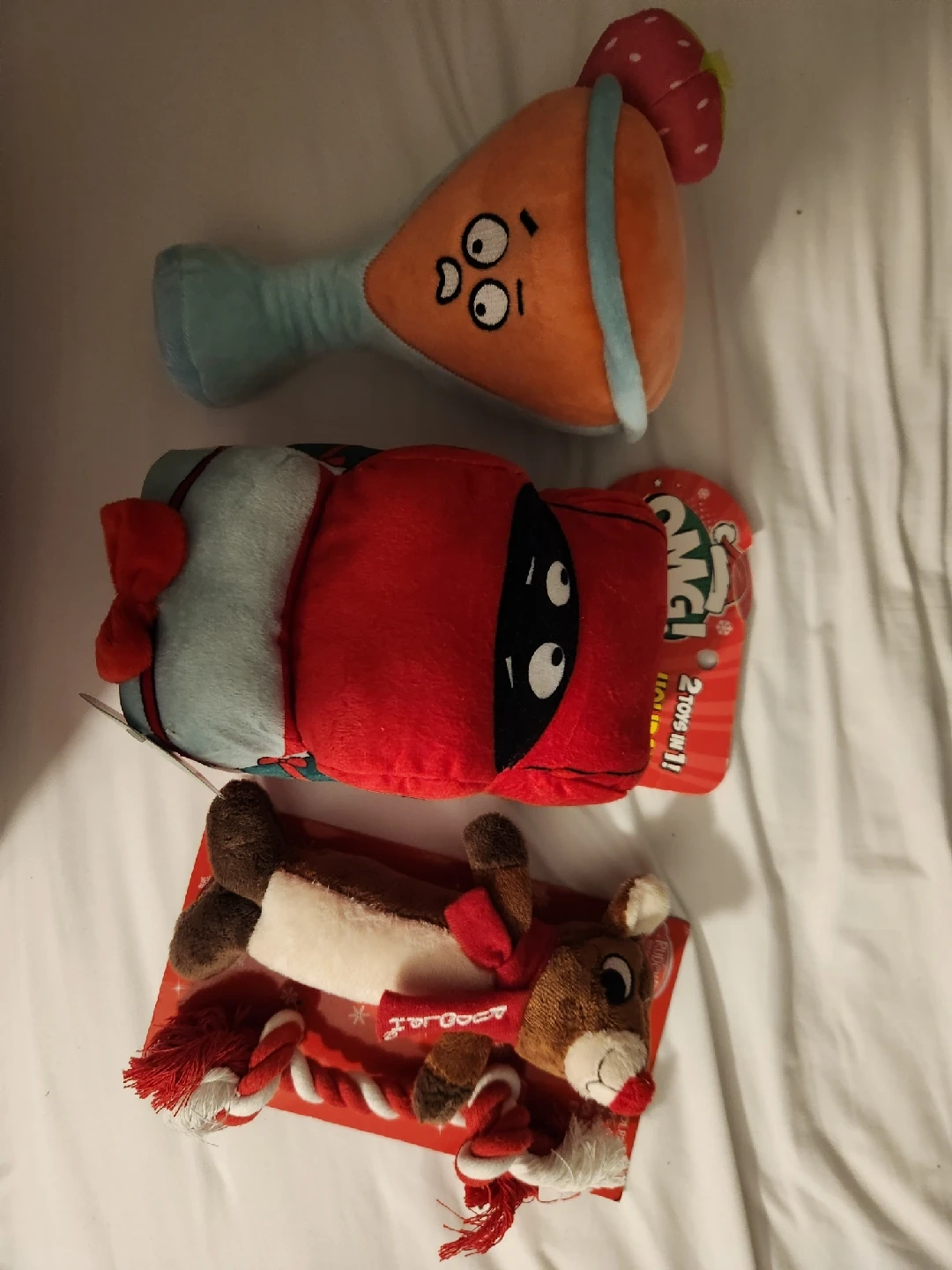 19Top and middle have bonus toy inside. Both are the OMG Surprise brand. Rudolph is a squeaker toy. All brand new. All 3 for $15