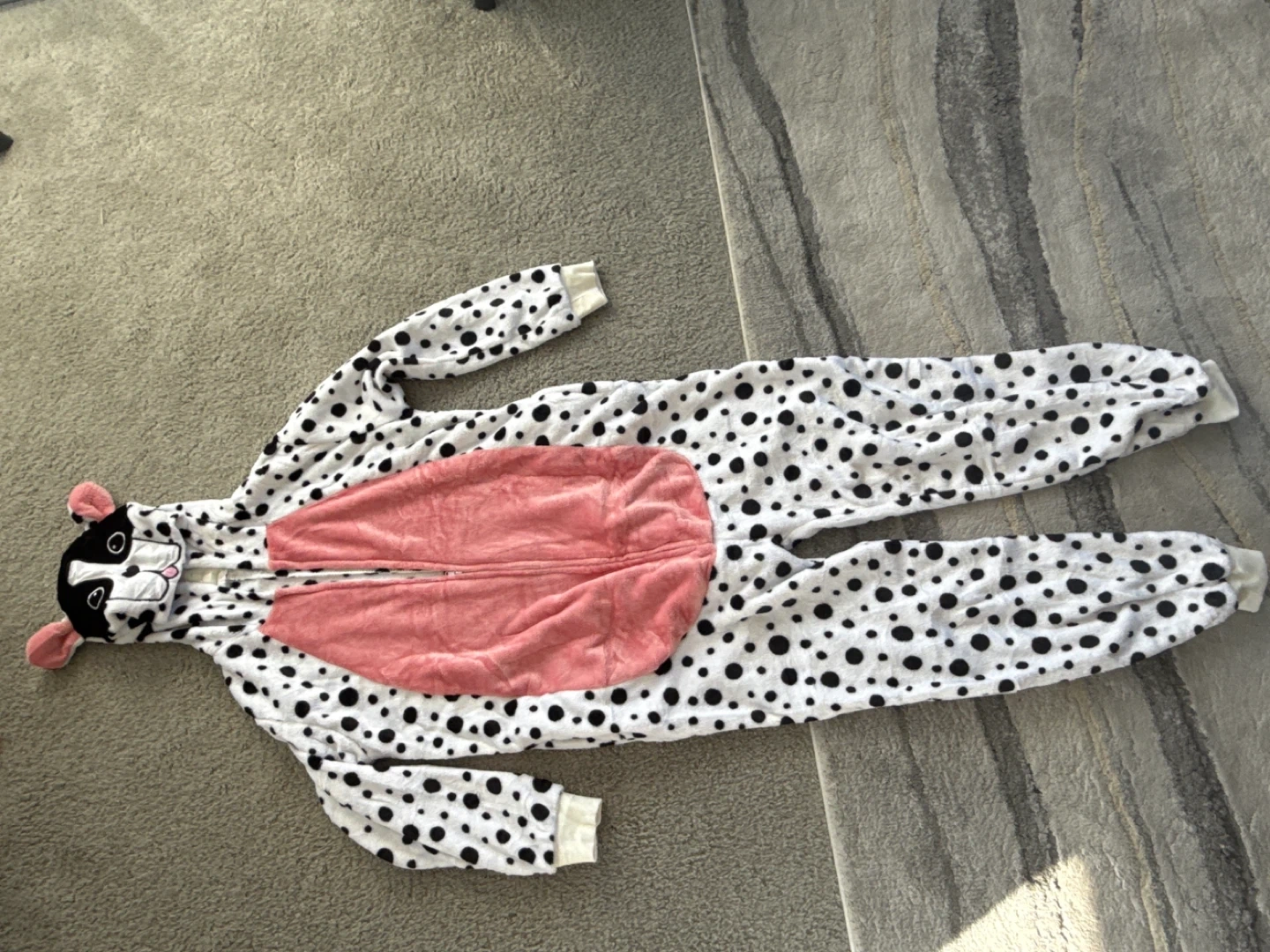12Super cute dog print onesie! It's in great condition and perfect for lounging around the house or for a fun costume party. It's an adult size, so it should fit most people comfortably. The material is soft and cozy, perfect for staying warm on chilly evenings