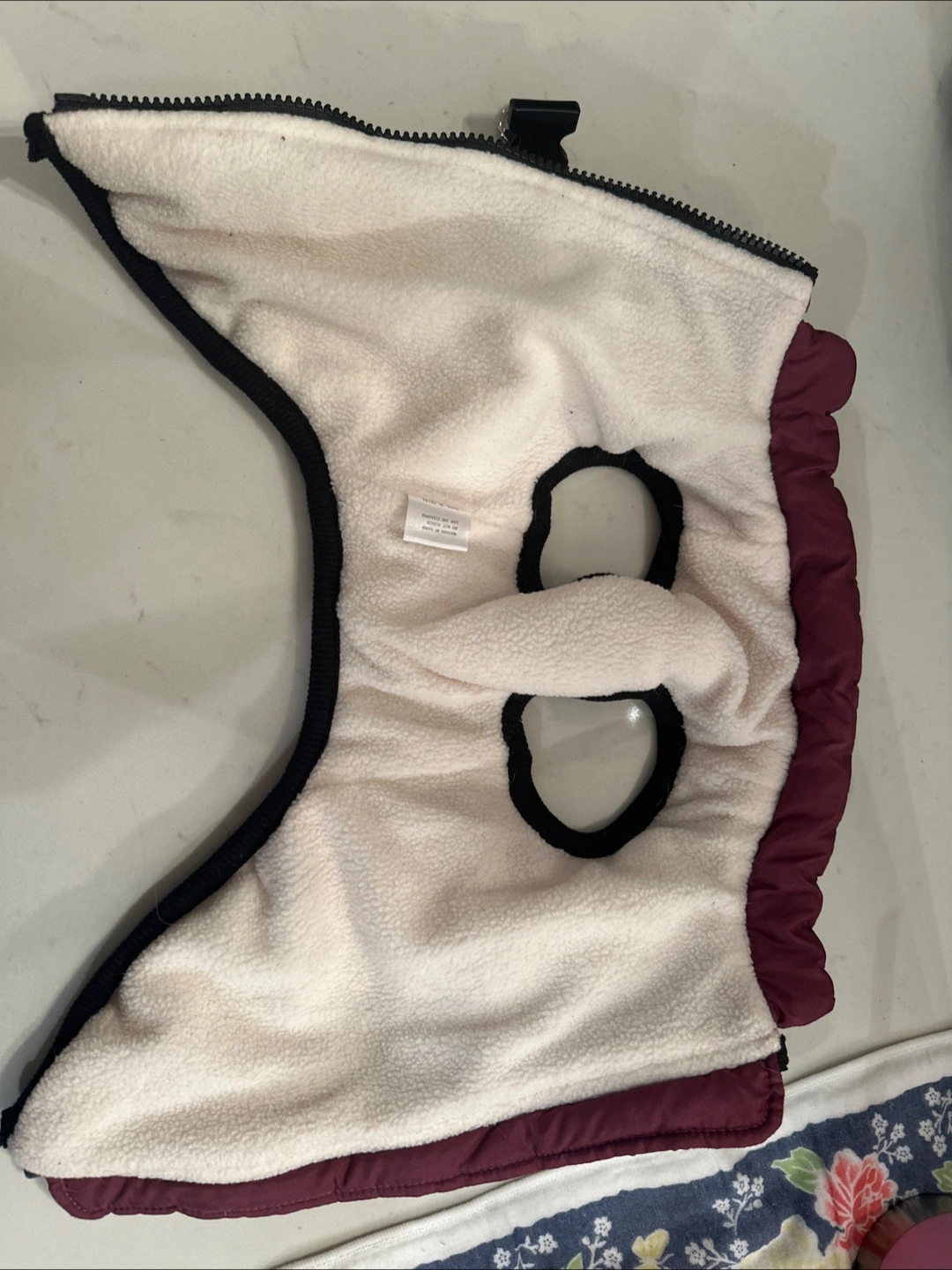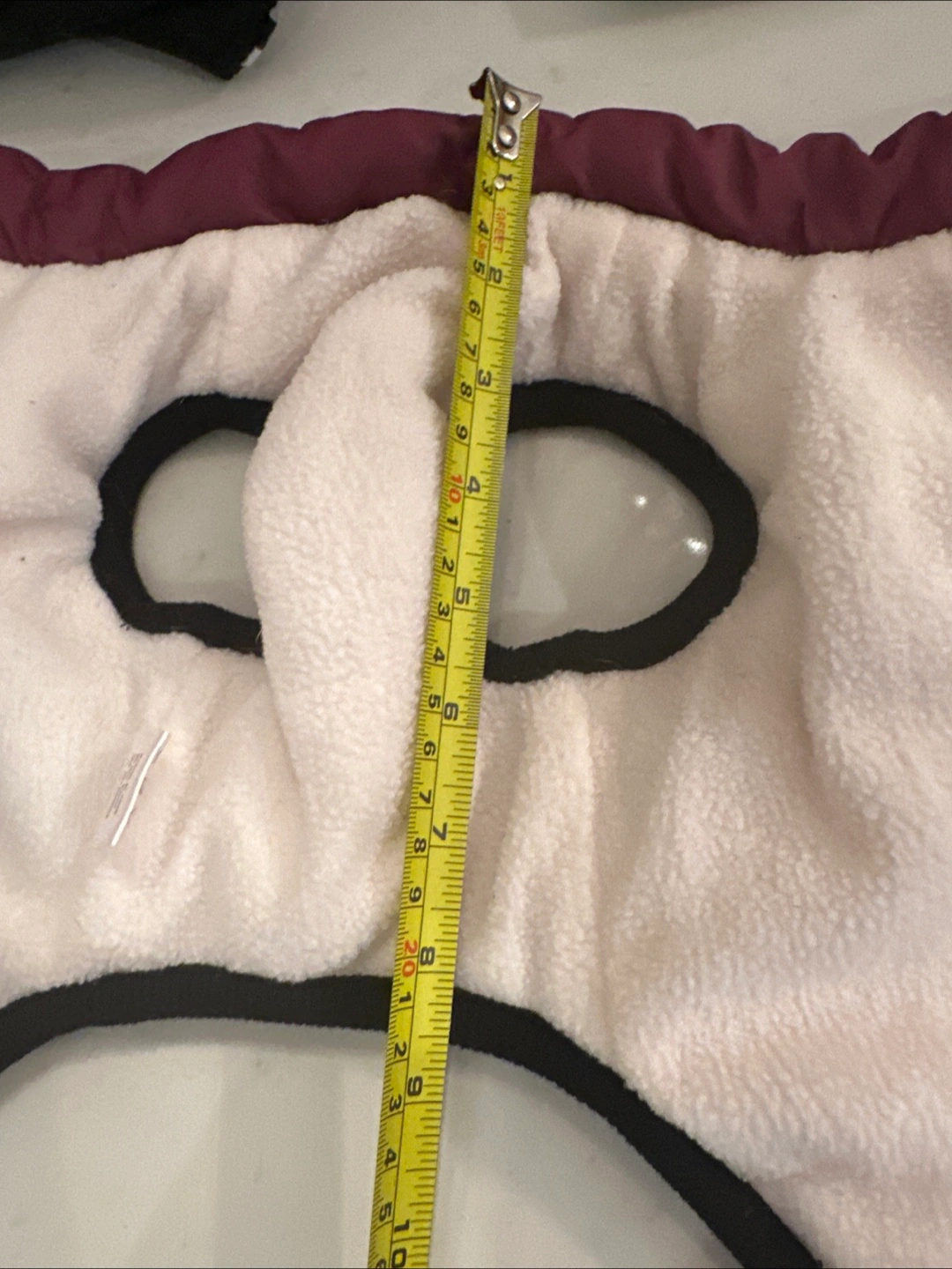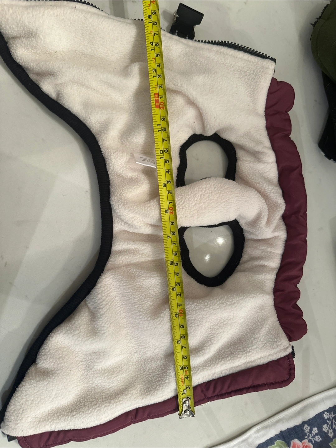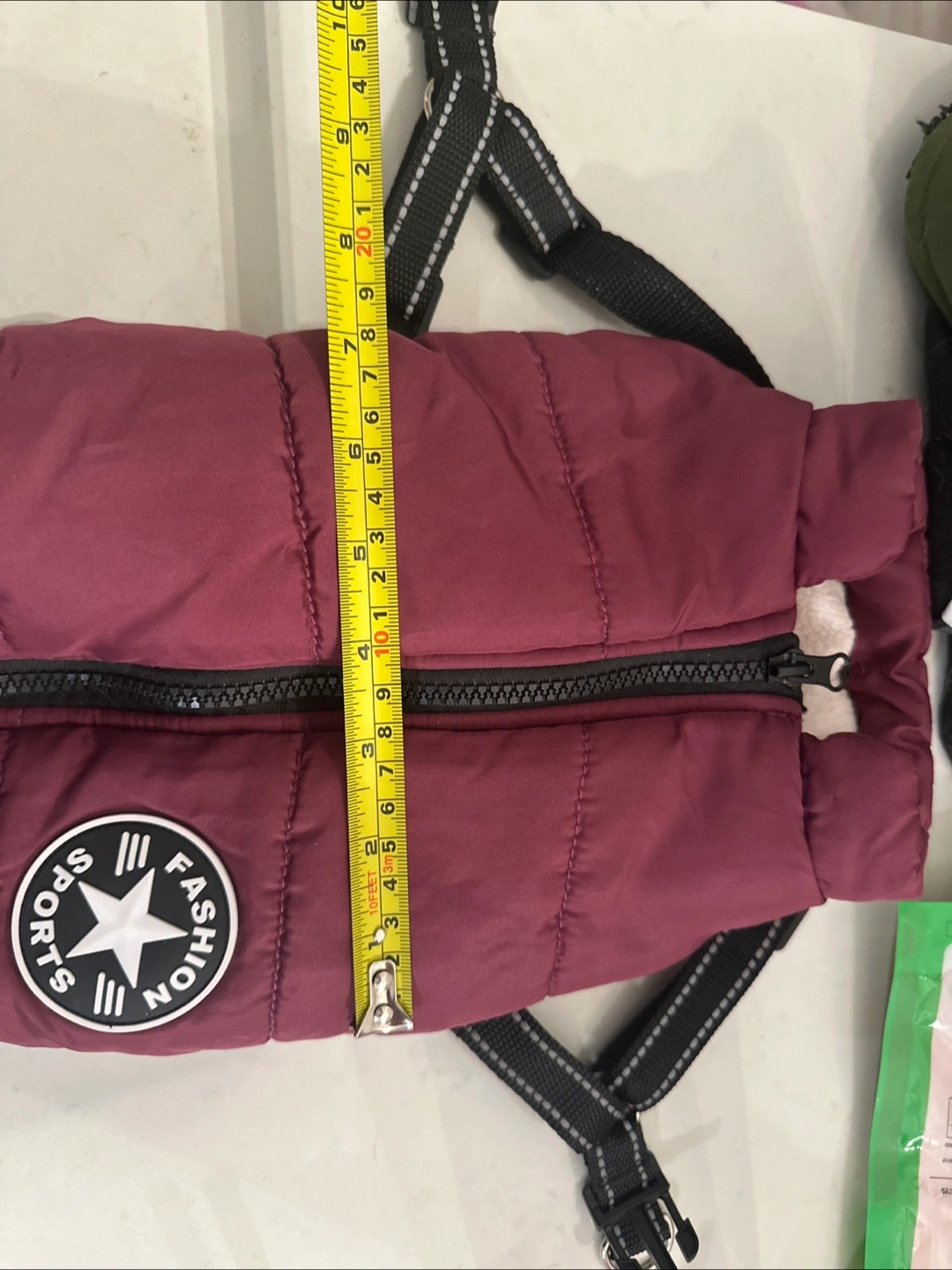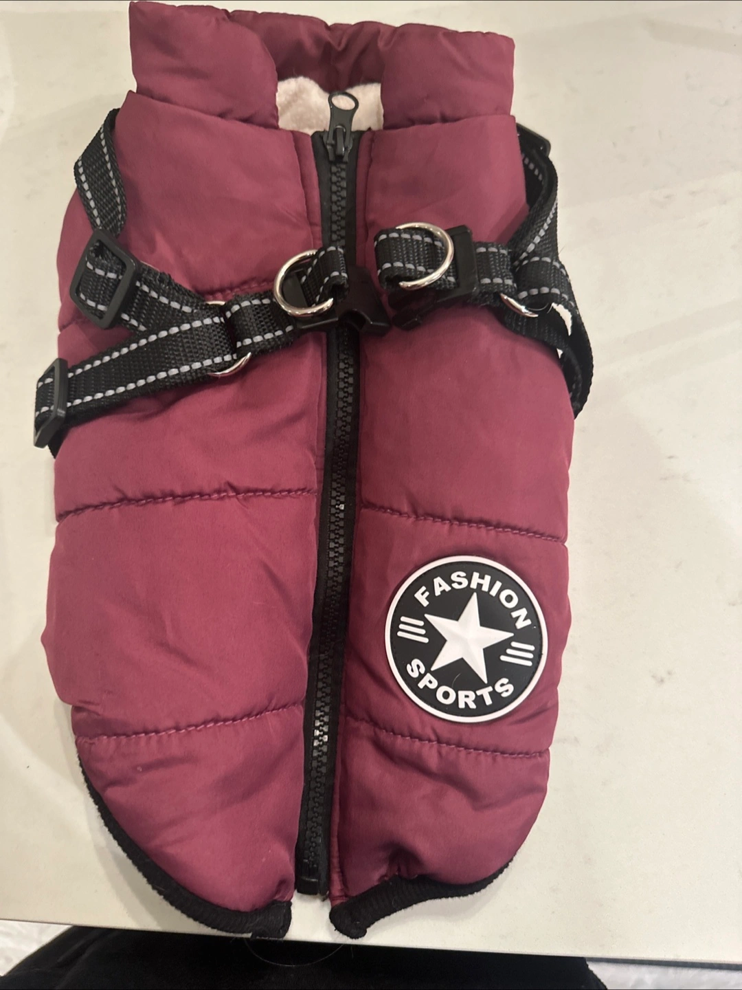 150Snug and stylish dog puffer jacket! It's in great condition and ready to keep your furry friend warm. The jacket is maroon and appears to be a size small, perfect for smaller breeds. It's designed with a harness and leash attachment, making walks easy and comfortable for your pup