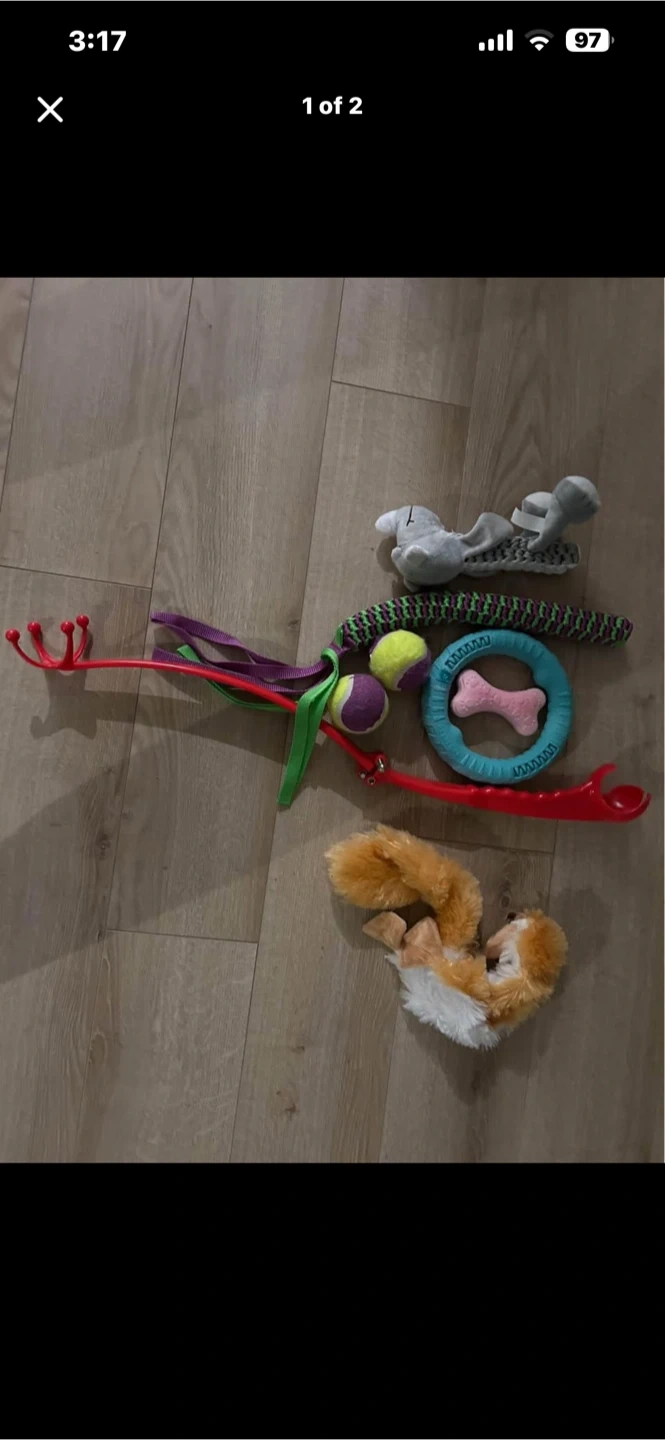 14Selling a bundle of dog toys! Includes a plush squirrel, rope toy, tennis balls, and other fun items for your furry friend