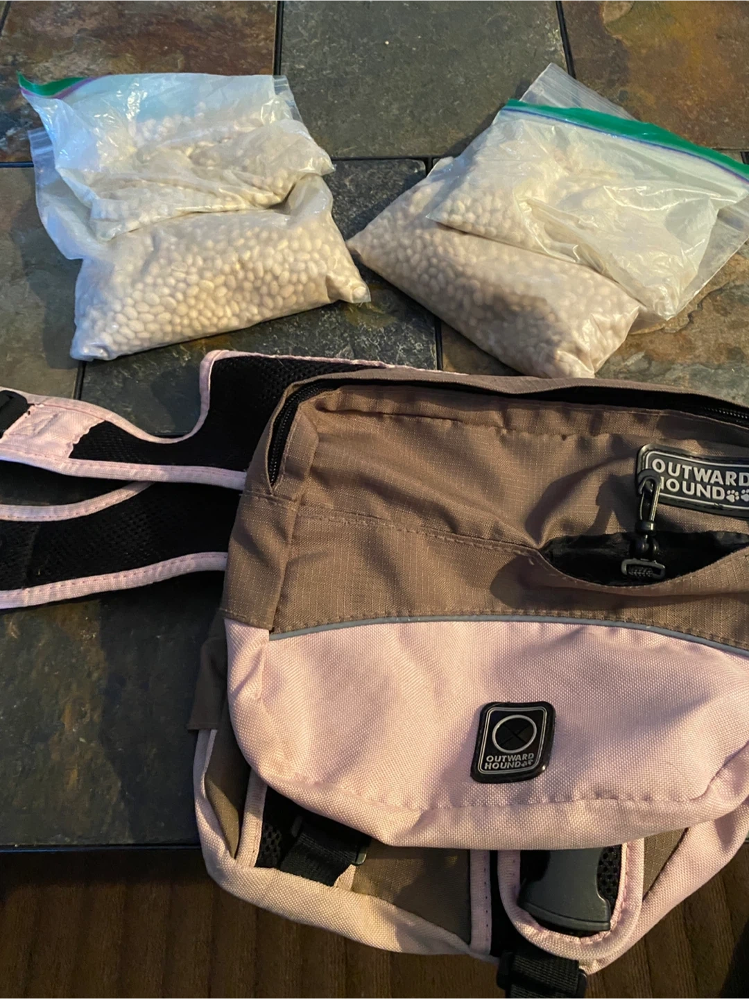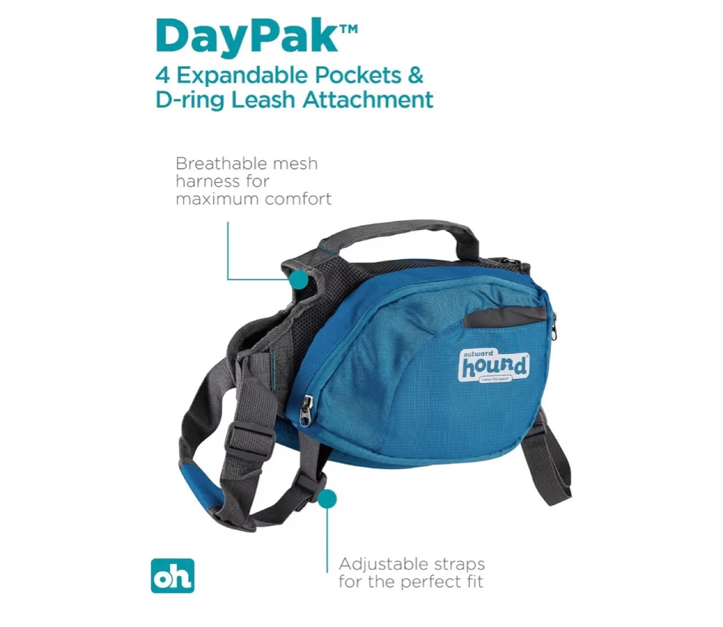 53You can also use this for a weighted vest, I will include the baggies of beads. This vest also has a clip for your keys as seen in pictures Freshly washed and ready to go Non-smoking house Size large Pick up Delton area 123ave- 95st HIGH-QUALITY HIKING GEAR: The Outward Hound DayPak is one of our bestselling and most popular dog backpacks. Lightweight and convenient, this pack can comfortably fit extra essentials you may need while exploring the great outdoors. FOUR EXPANDABLE STORAGE COMPARTMENTS: This saddleback dog backpack is designed with two storage compartments on each side for even weight distribution and plenty of room for food, water, training accessories and more. BREATHABLE MESH & ADJUSTABLE STRAPS: The DayPak doggy backpack is thoughtfully constructed to keep your pet comfortable with breathable mesh fabric, adjustable straps, and bright colors for high visibility so you can stay worry-free day or night.