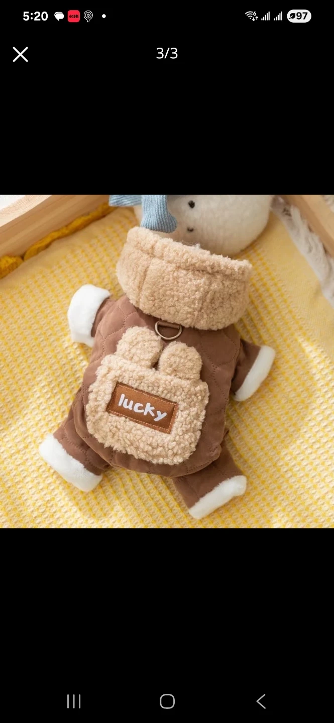 177A cozy brown winter coat for your furry friend! It has a cute 'lucky' patch and a warm, fuzzy collar to keep your dog snug during those chilly Canadian walks. For smaller dogs. Like new.