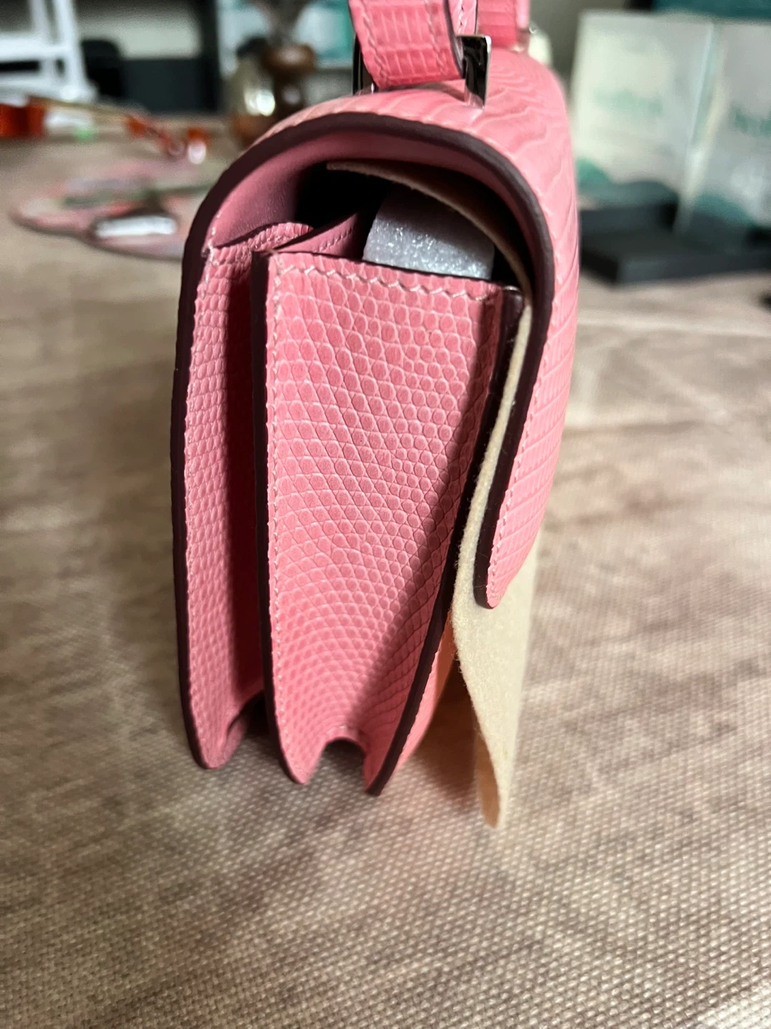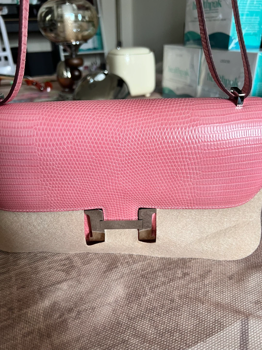 shoulder bag featuring a pink lizard exterior with a suede flap. It has a silver 'H' clasp closure and a single shoulder strap. Bag's interior is visible in one shot.