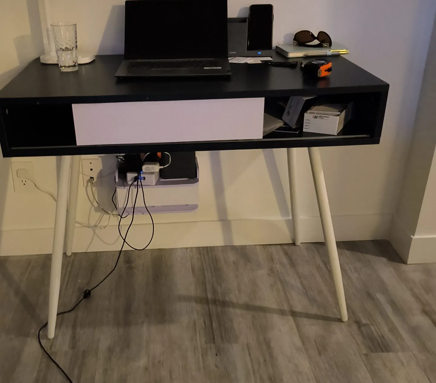 Sleek black desk featuring white tapered legs for a modern look. It's got a built-in drawer for extra storage. Perfect for a home office or study space!
