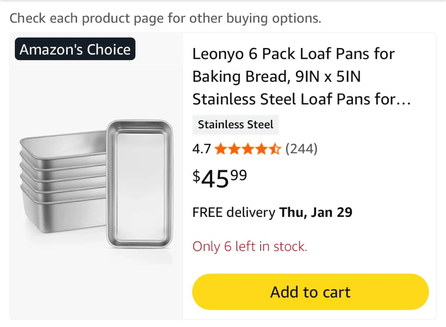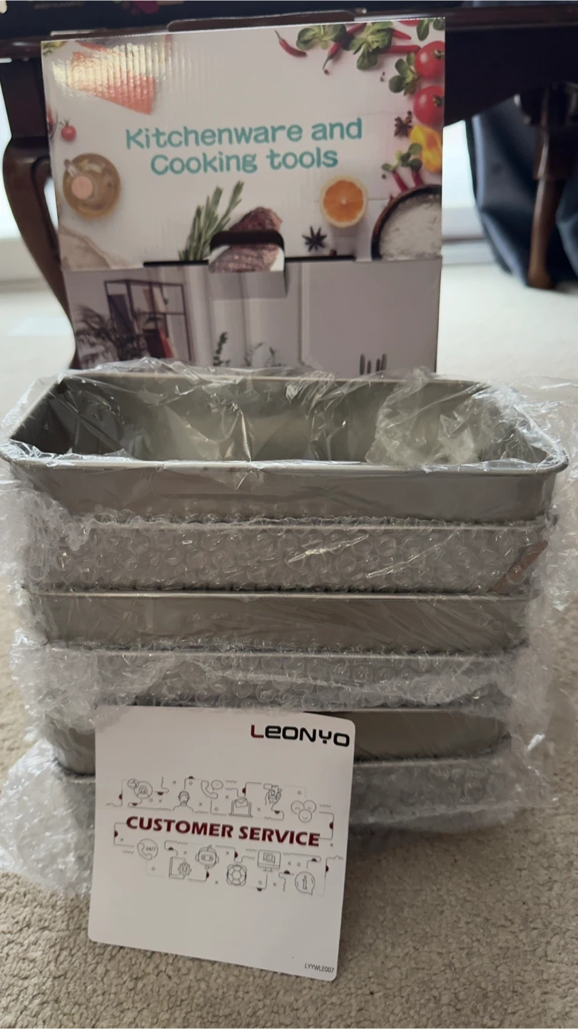 Leonyo 6 pack loaf pans for baking bread. Each pan is 9IN x 5IN and made of stainless steel. These are new and still in original packaging.