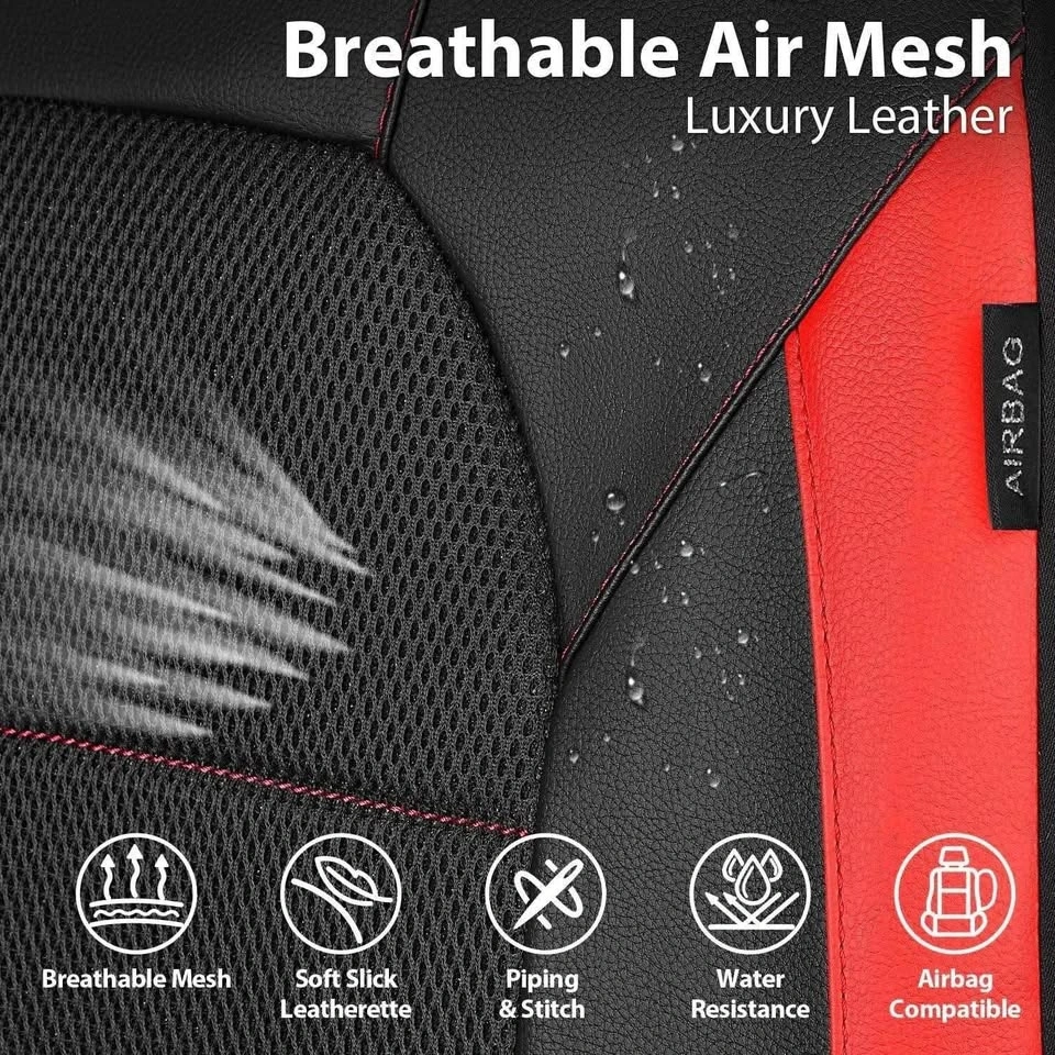 CAR PASS Leather and Mesh Universal Car Seat Covers, Airbag Compatible, for Sedans, Trucks, Suvs (Full Set, Black and Red)