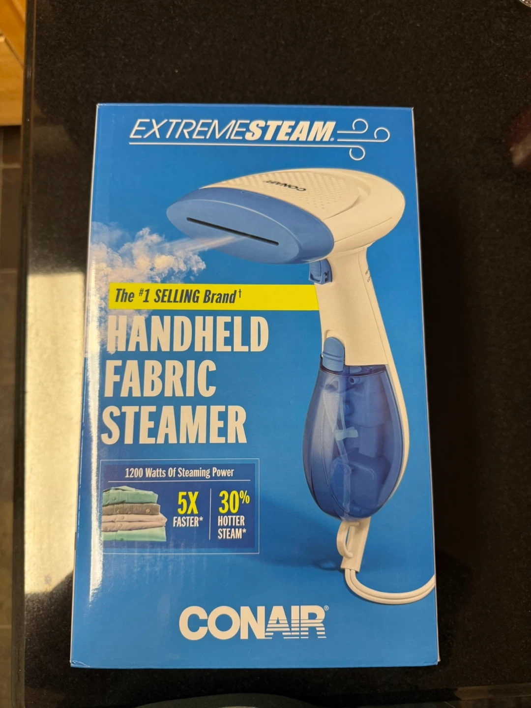 Selling a Conair handheld fabric steamer! It's in great condition and comes with the original box. This steamer heats up in just 60 seconds and offers 1100W of extreme clothing steaming power. It's also a travel steamer, so it's lightweight and portable! Perfect for quick touch-ups or taking on trips