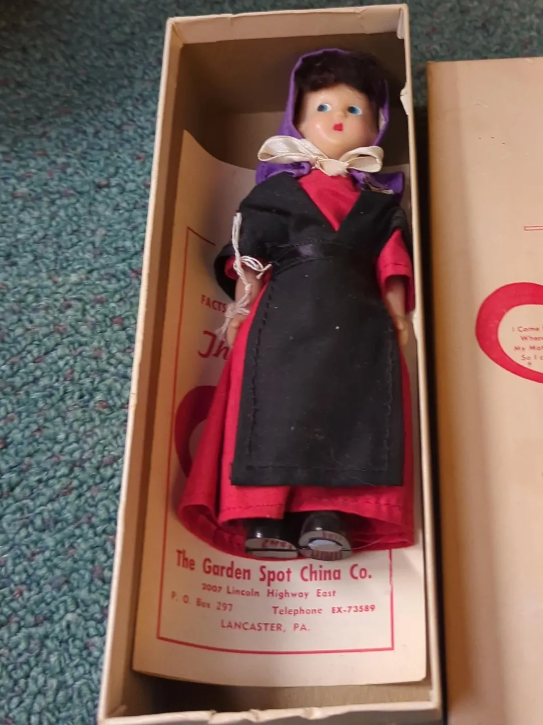 This doll is from The Garden Spot China Co. in Lancaster, PA. It features a red dress with a black apron and purple headscarf. It comes in its original box. The doll has blue eyes and dark hair.