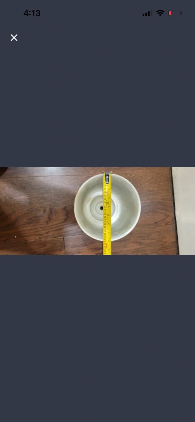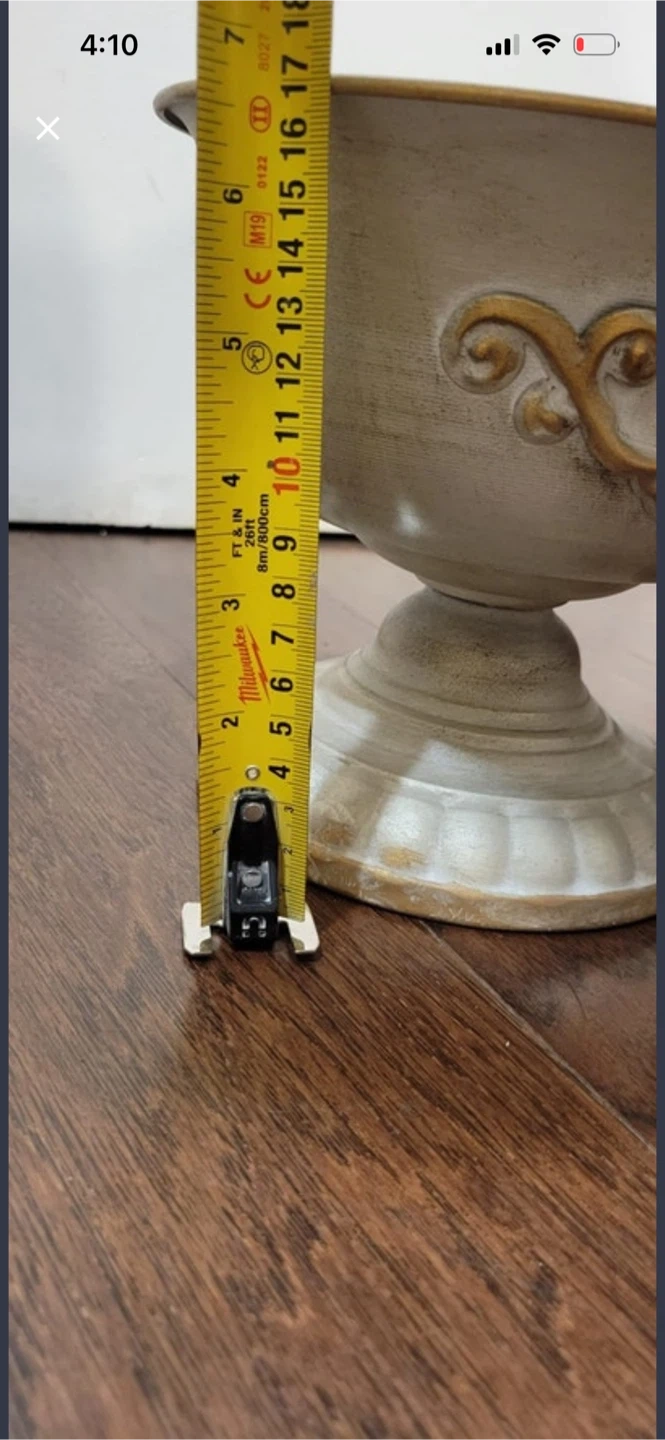 This decorative urn has an antique finish with scroll details. It's approximately 8 inches tall and 6 inches wide. This piece can be used as a planter or for decorative display.