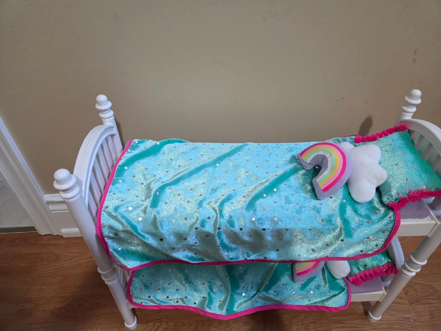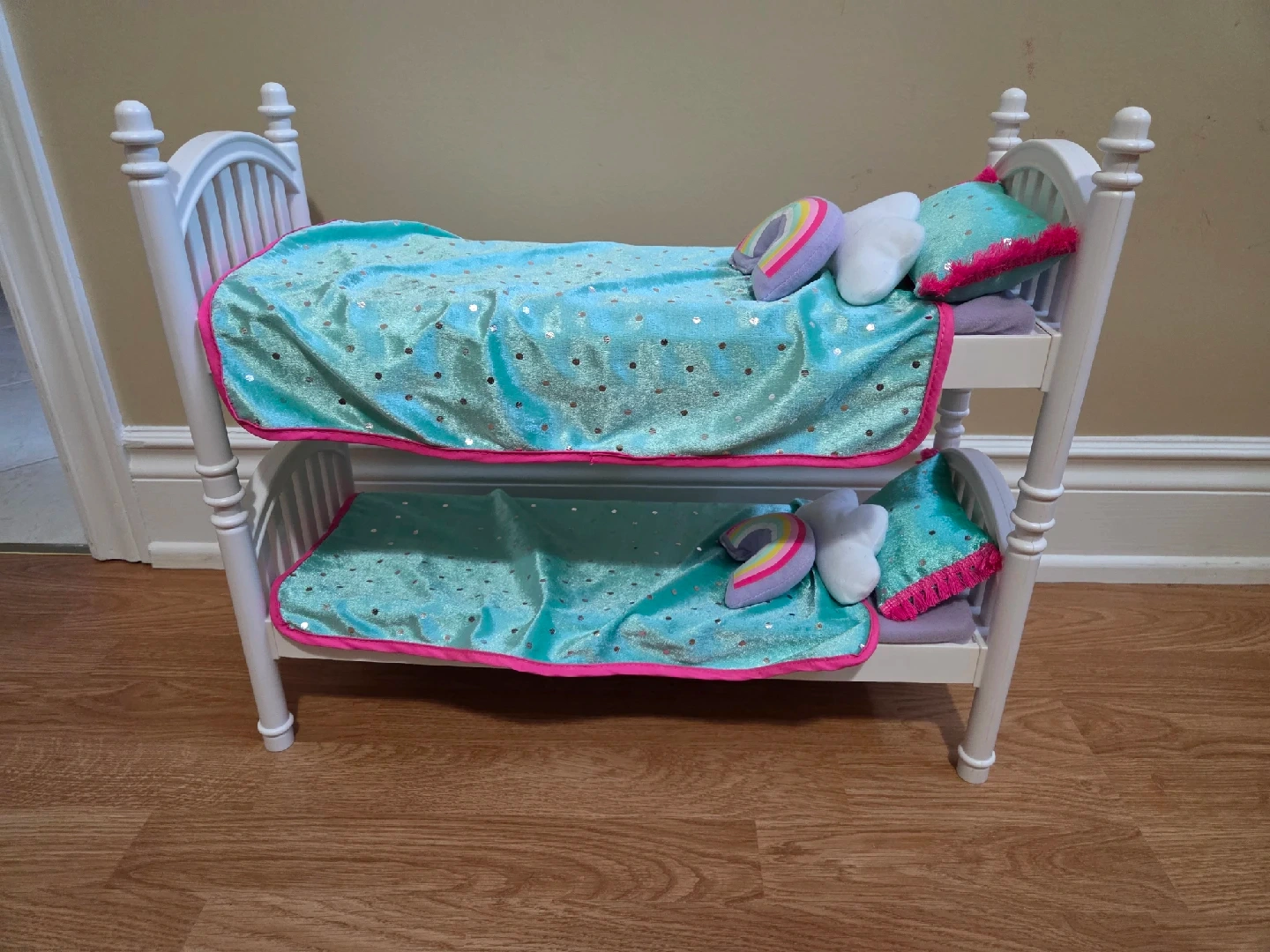 87A cute doll bunk bed, perfect for your little one's dolls! It comes with bedding, including a blanket and pillows, so the dolls can sleep comfortably. The bed is white and has a fun design.