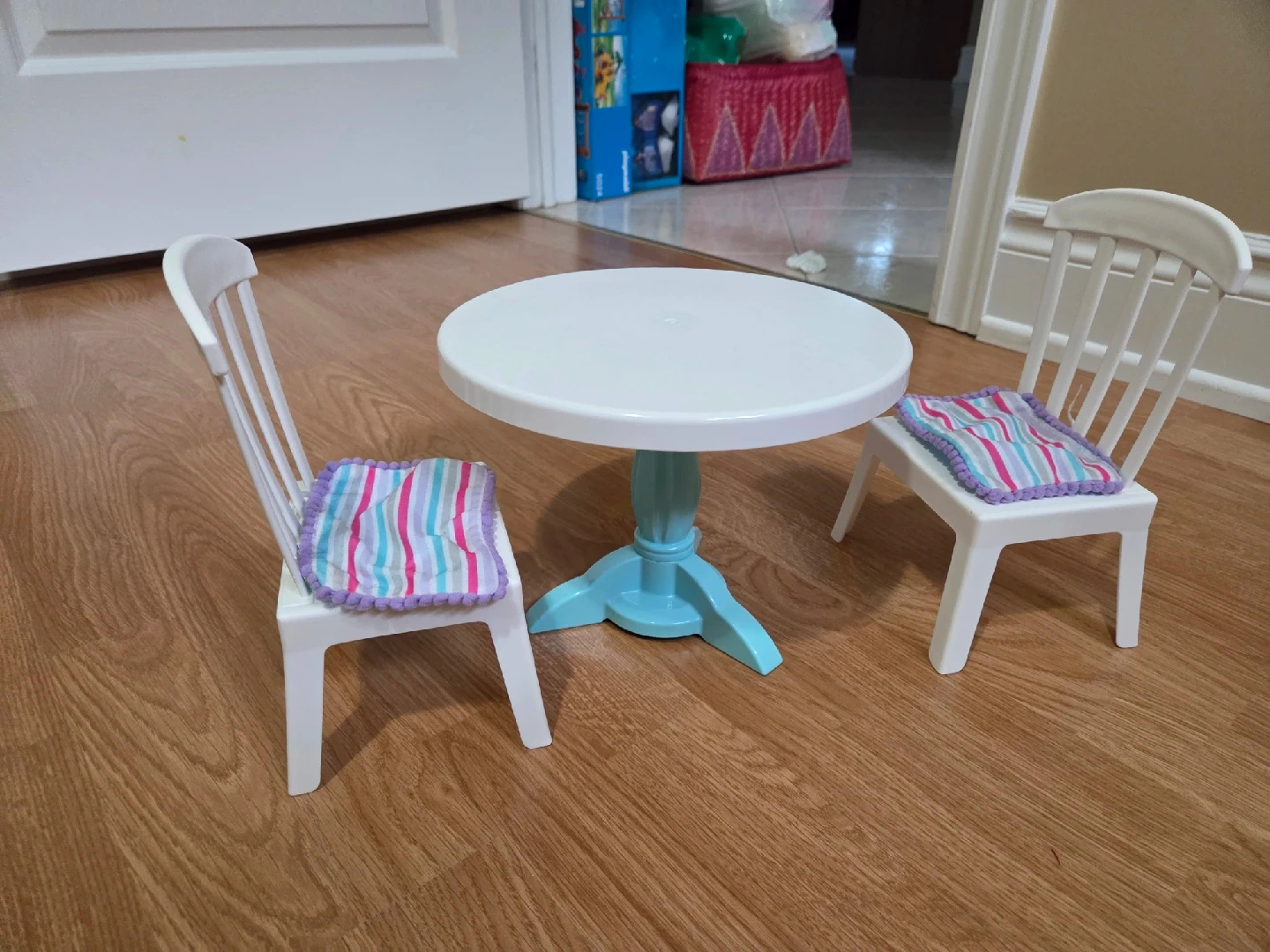 87This is a cute doll table and chair set. It's perfect for your little one's dolls to have tea parties or enjoy a meal. The set includes a round table and two chairs, each with a striped cushion. It's in great condition and ready for a new home!