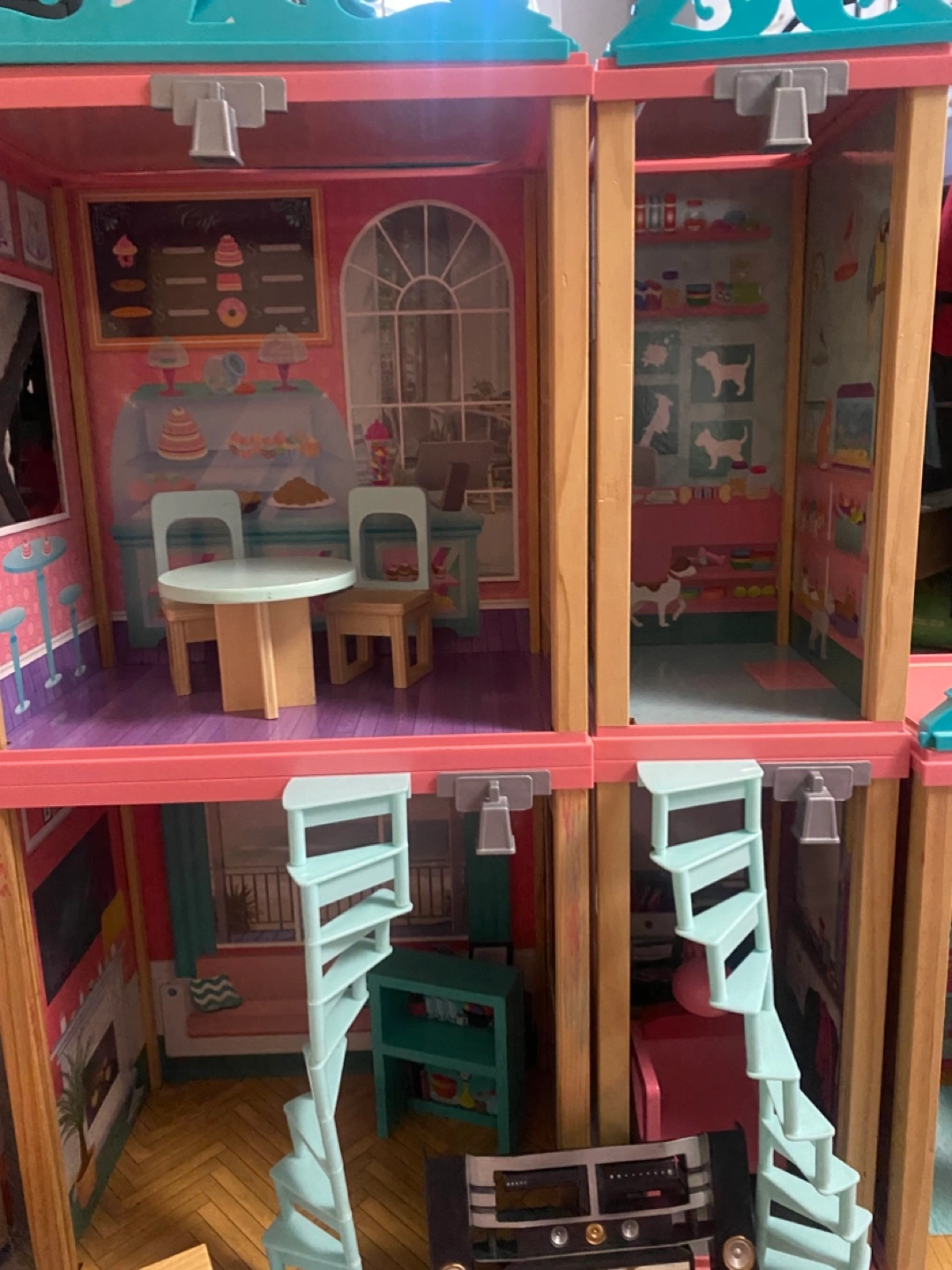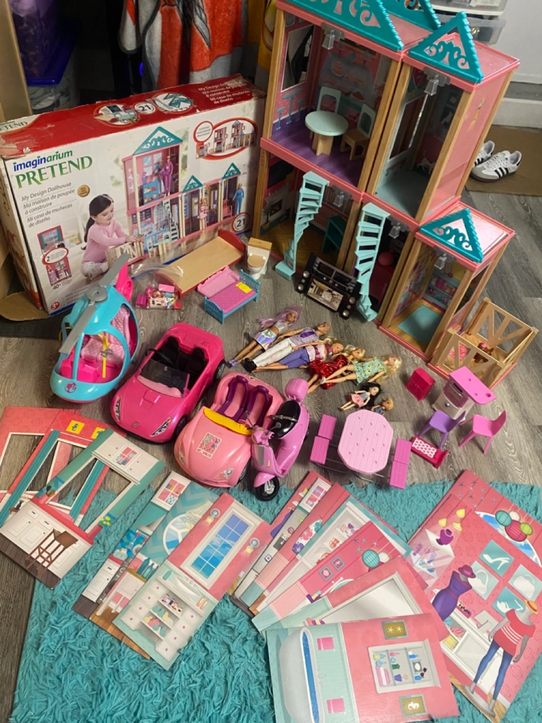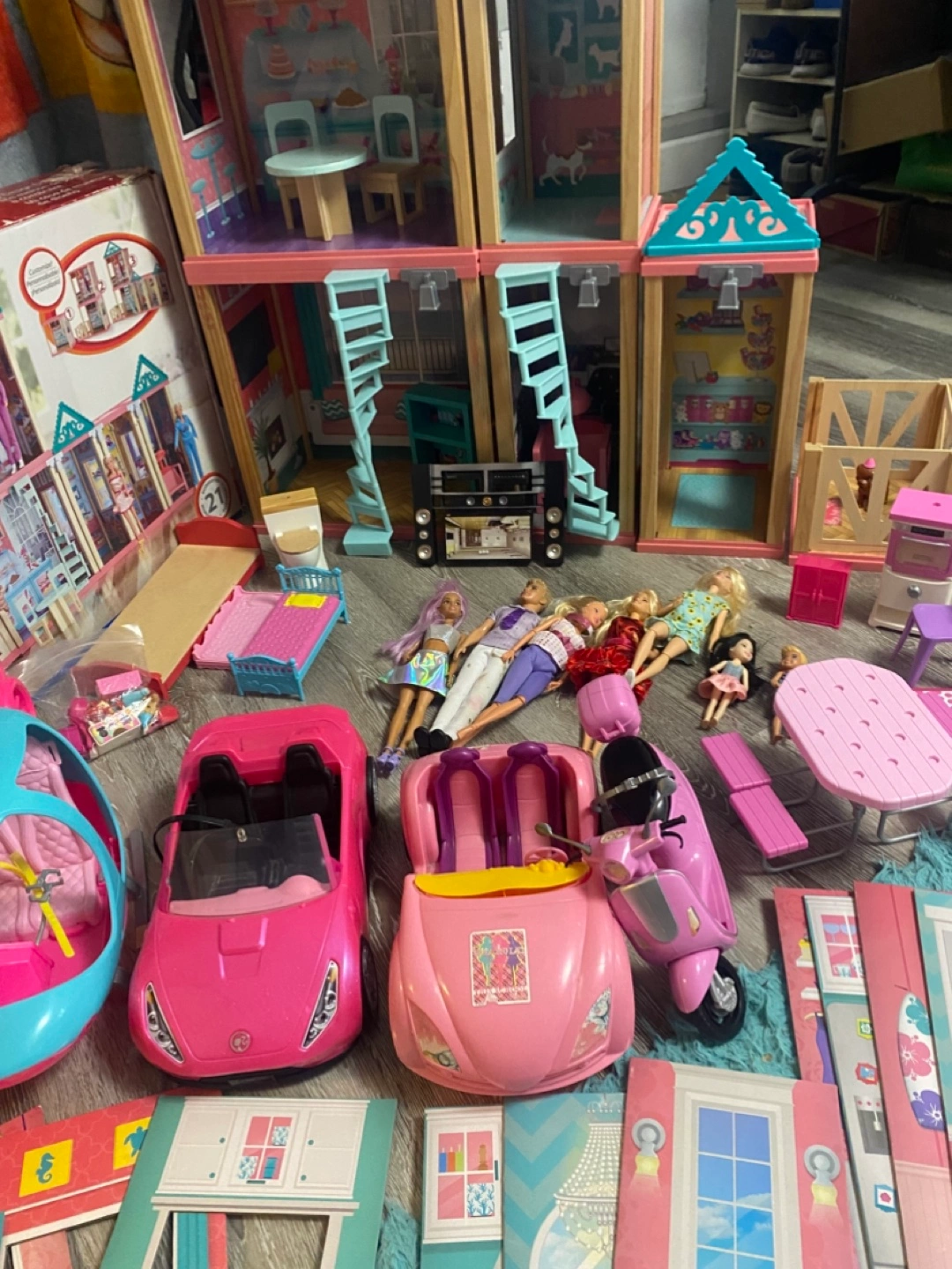 A dollhouse with several rooms and furniture. Comes with additional accessories like vehicles and several dolls. This would be a great item to bring out on a rainy day to spend some time with.