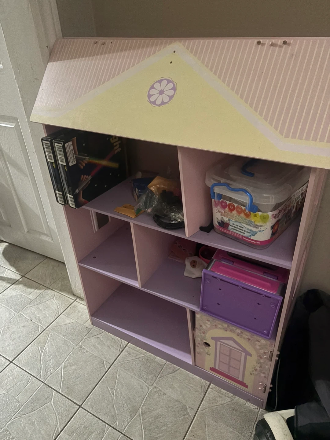 Selling a cute dollhouse bookcase, perfect for a kid's room! It's in good condition and offers plenty of space for books, toys, and other treasures. The bookcase has a charming dollhouse design with multiple shelves. It is very cute!
