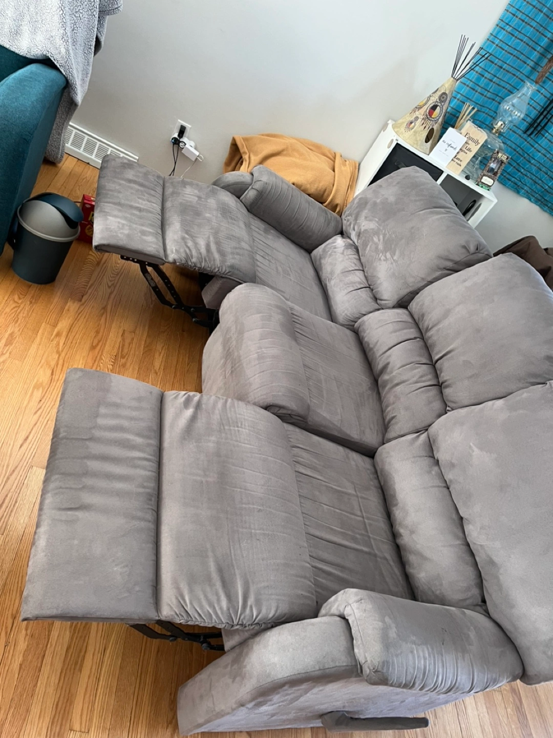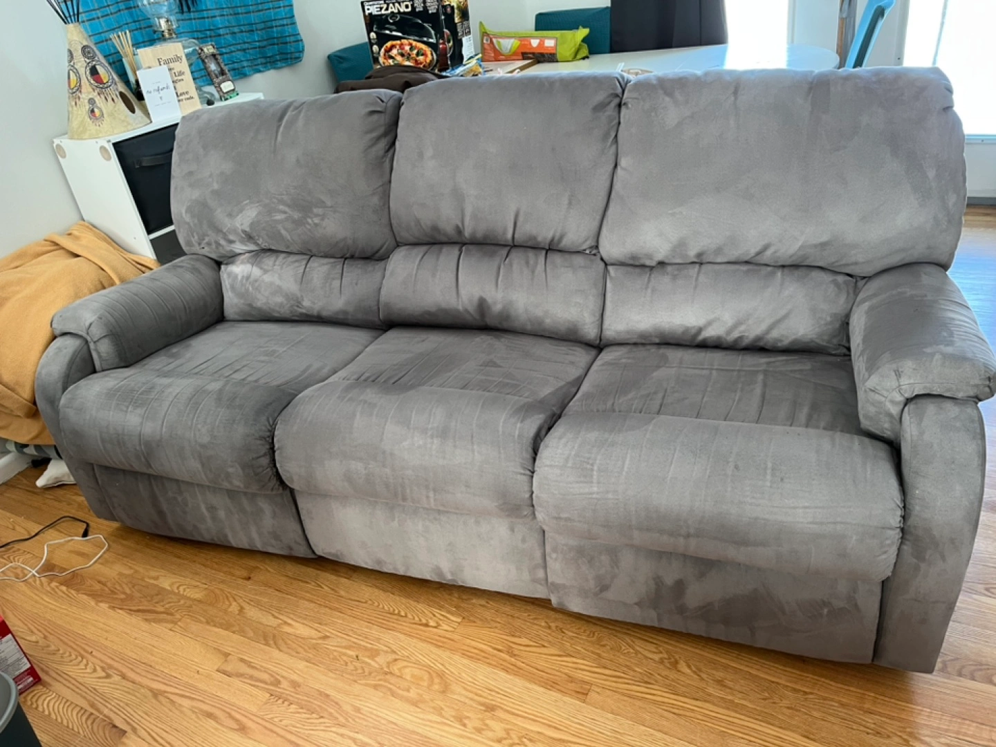 Three-seater reclining sofa. Grey microfiber fabric. Features cup holders and storage compartments. Good condition.