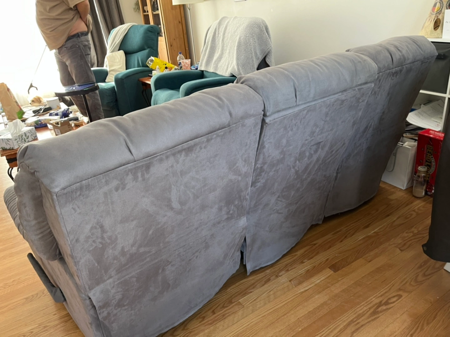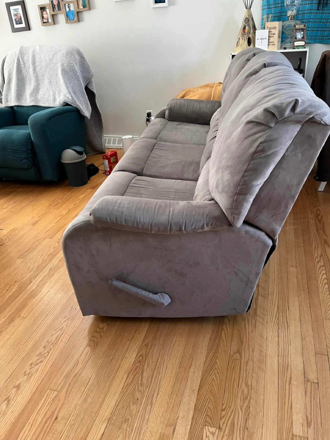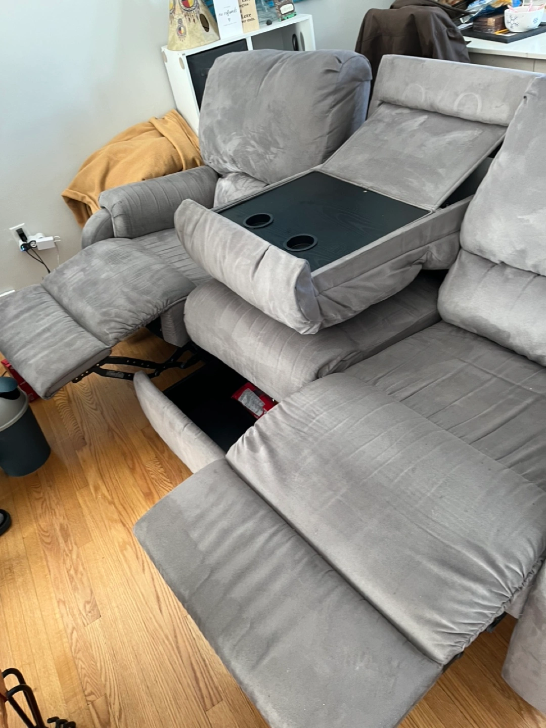 Three-seater reclining sofa. Grey microfiber fabric. Features cup holders and storage compartments. Good condition.