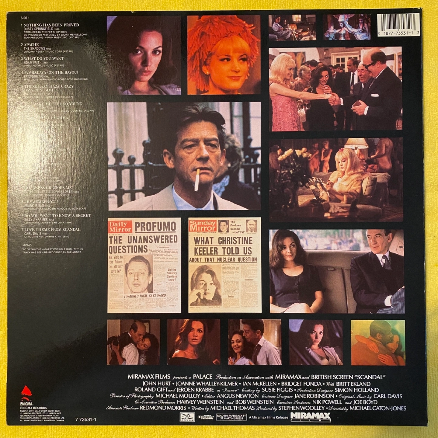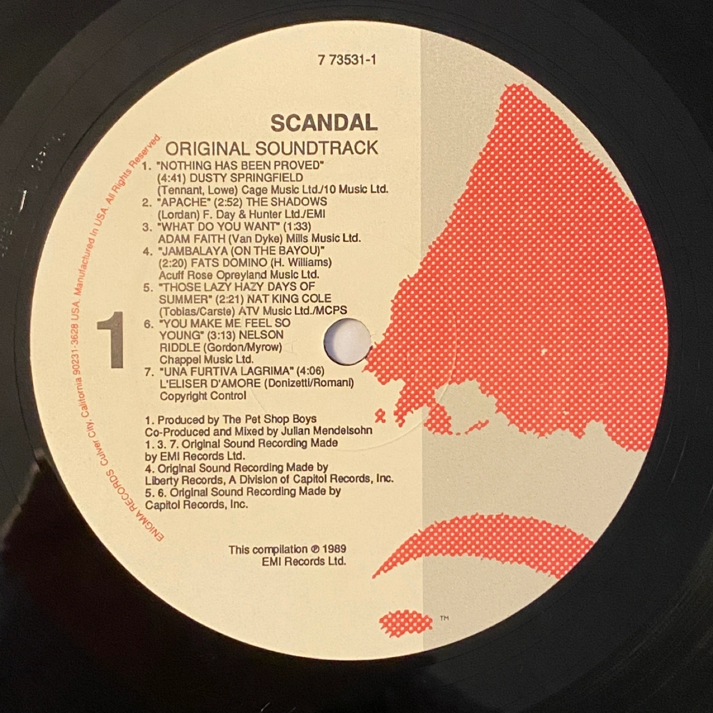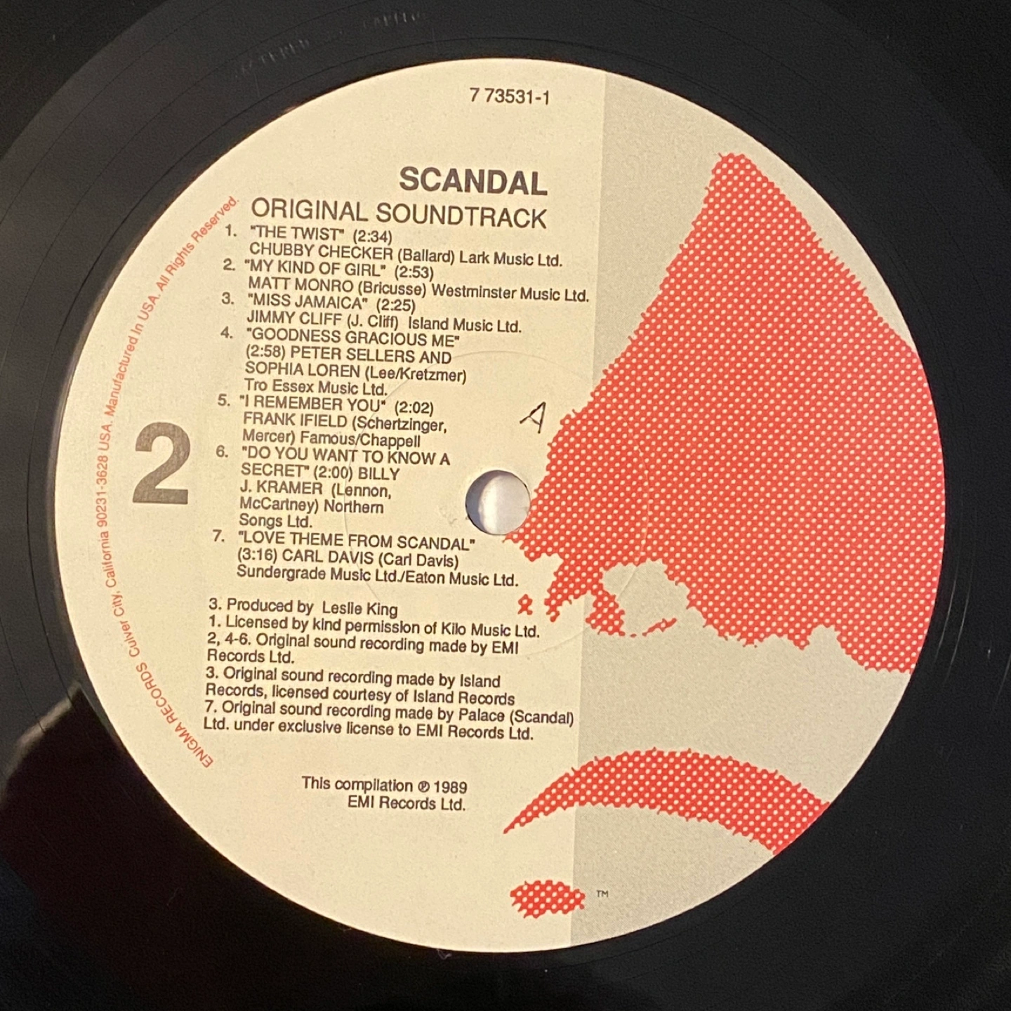 Sandal, Music From The Motion Picture vinyl record. Enigma Records US 773531-1 (UPC 018777353113), 1989 (Original 1st US gatefold pressing). Scandal, soundtrack for the 1989 British drama film. The album featured the following 14tracks:
