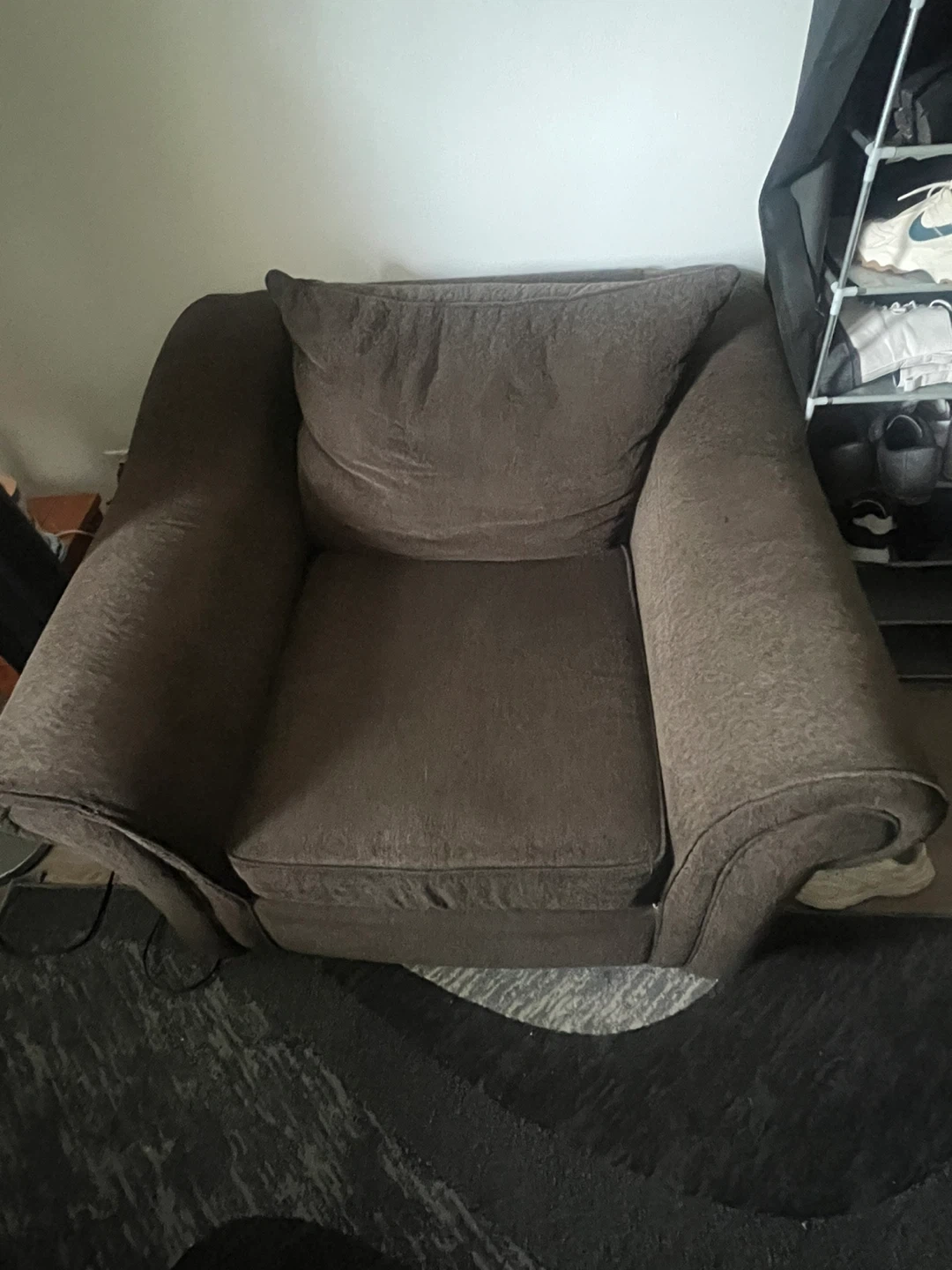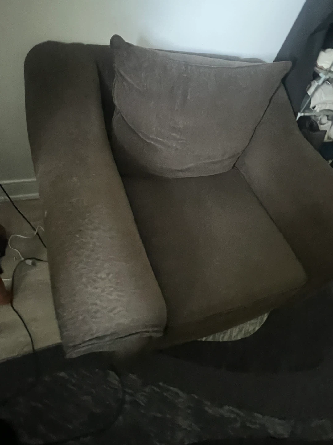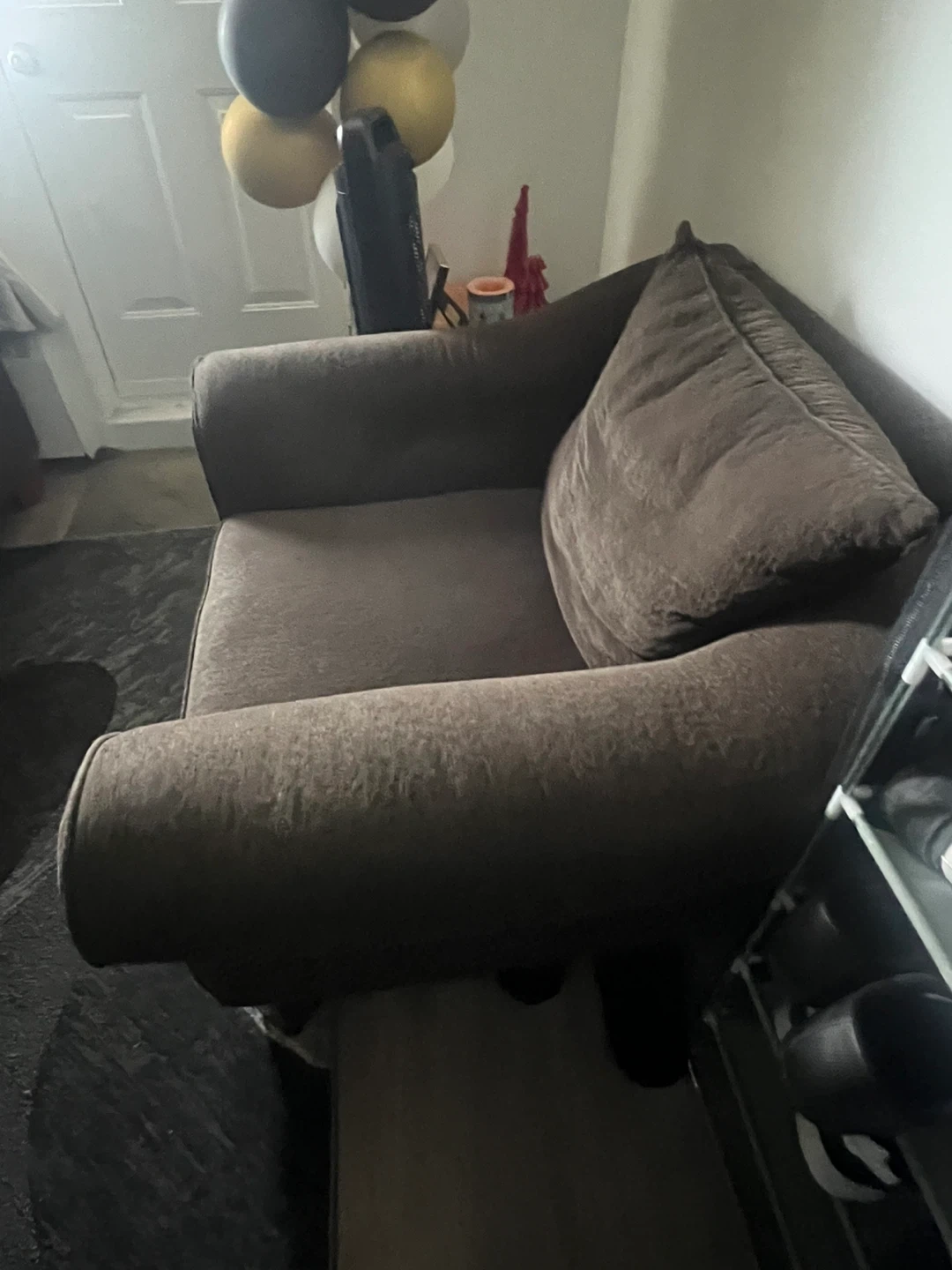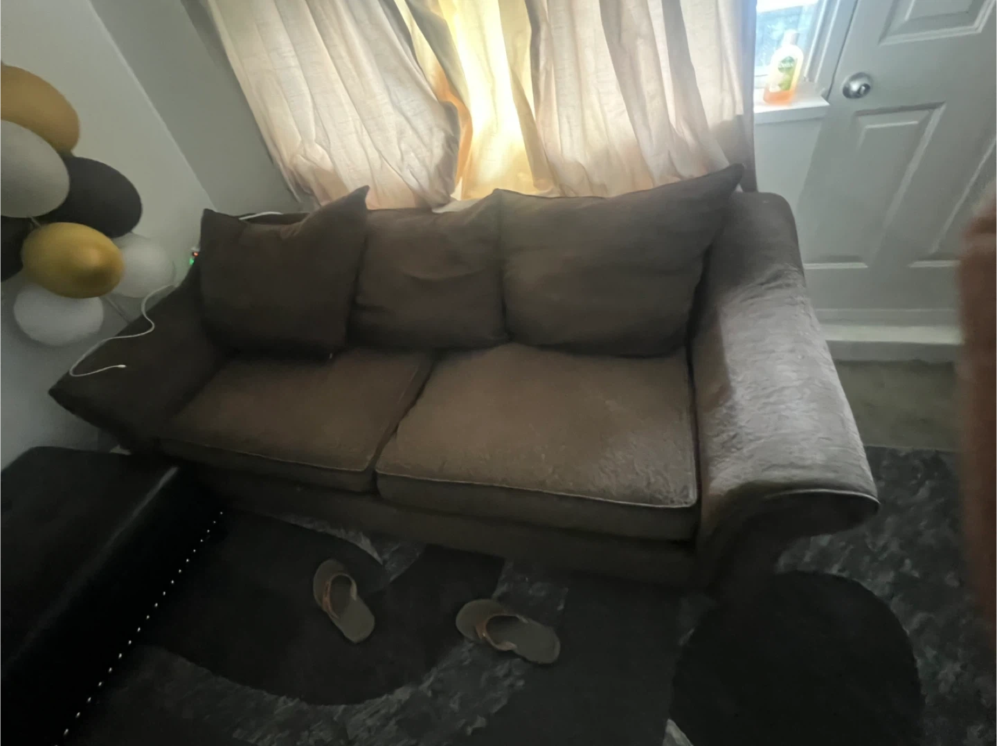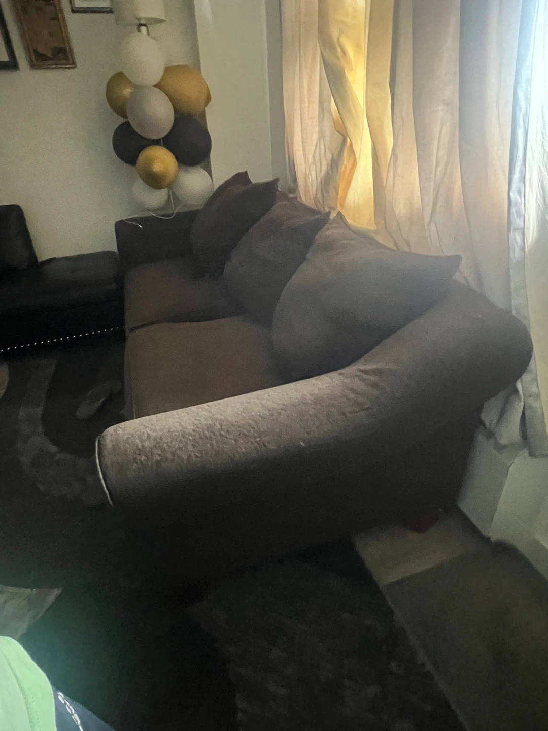 This is a comfortable brown fabric sofa with plush cushions. It has wide armrests and a soft texture. This sofa's design makes it a cozy addition to any living space.This is brand new almost couples time used both pairs