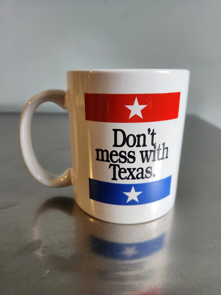 Selling a mug with the text "Don't mess with Texas" and a red and blue banner with a star on it!