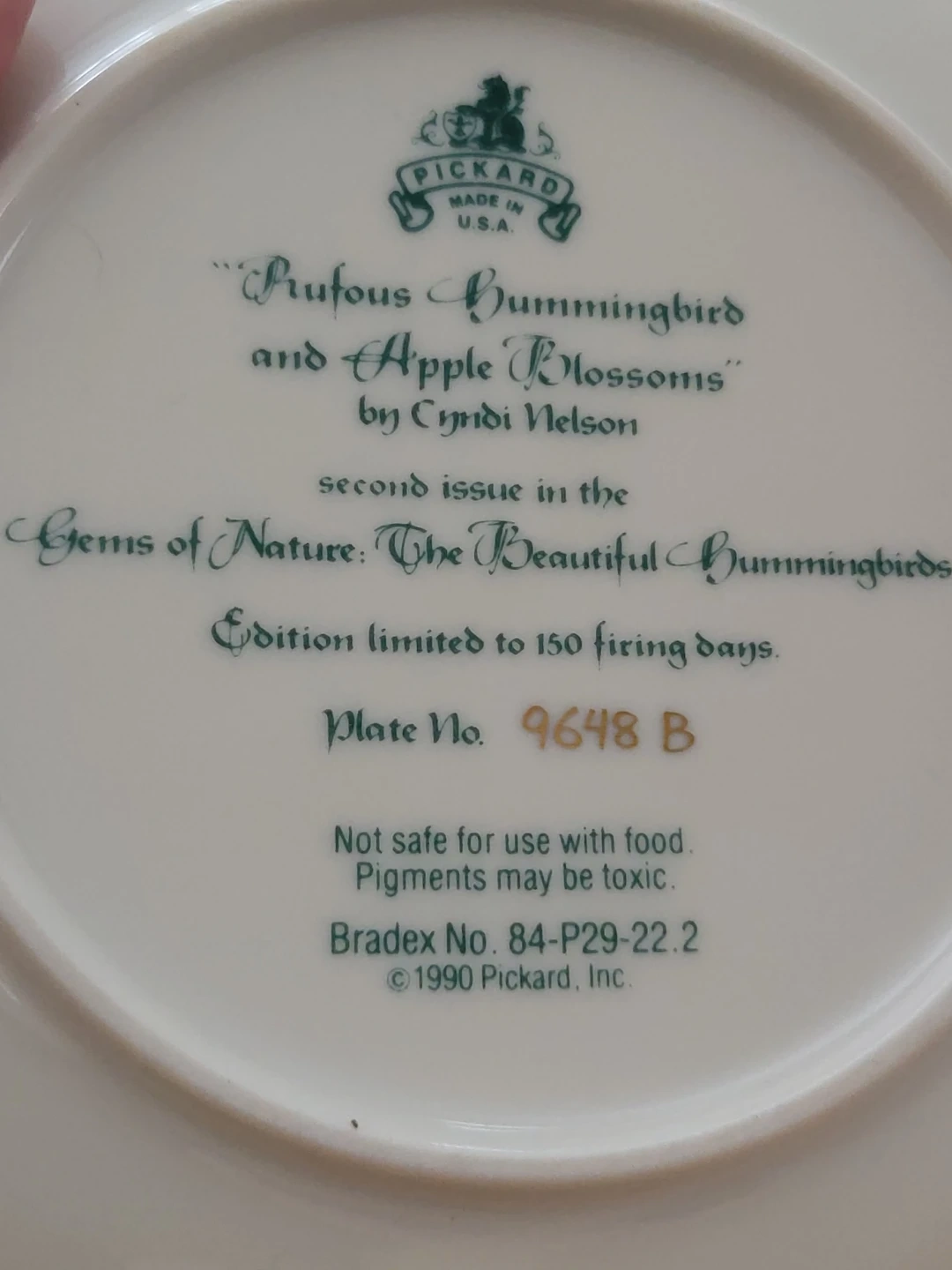 This is the second issue in the Gems of Nature: The Beautiful Hummingbirds series, "Profuse Hummingbird and Apple Blossoms" by Cyndi Nelson. It's a limited edition collector plate from Pickard, Inc. Note: Not safe for use with food; pigments may be toxic.