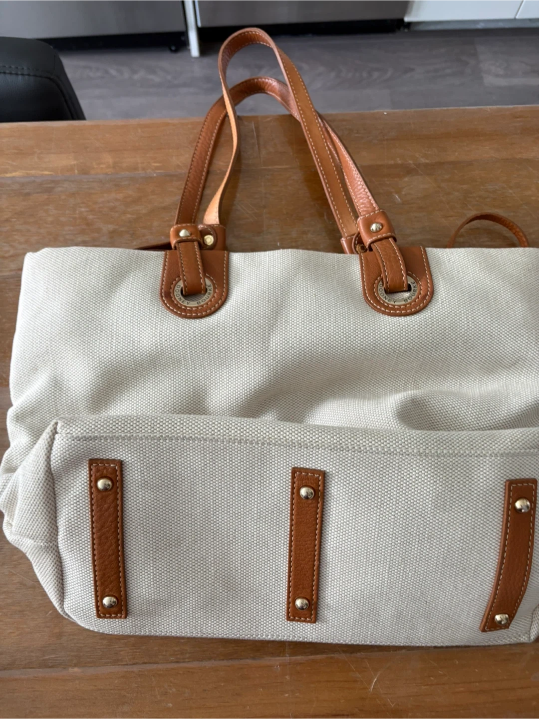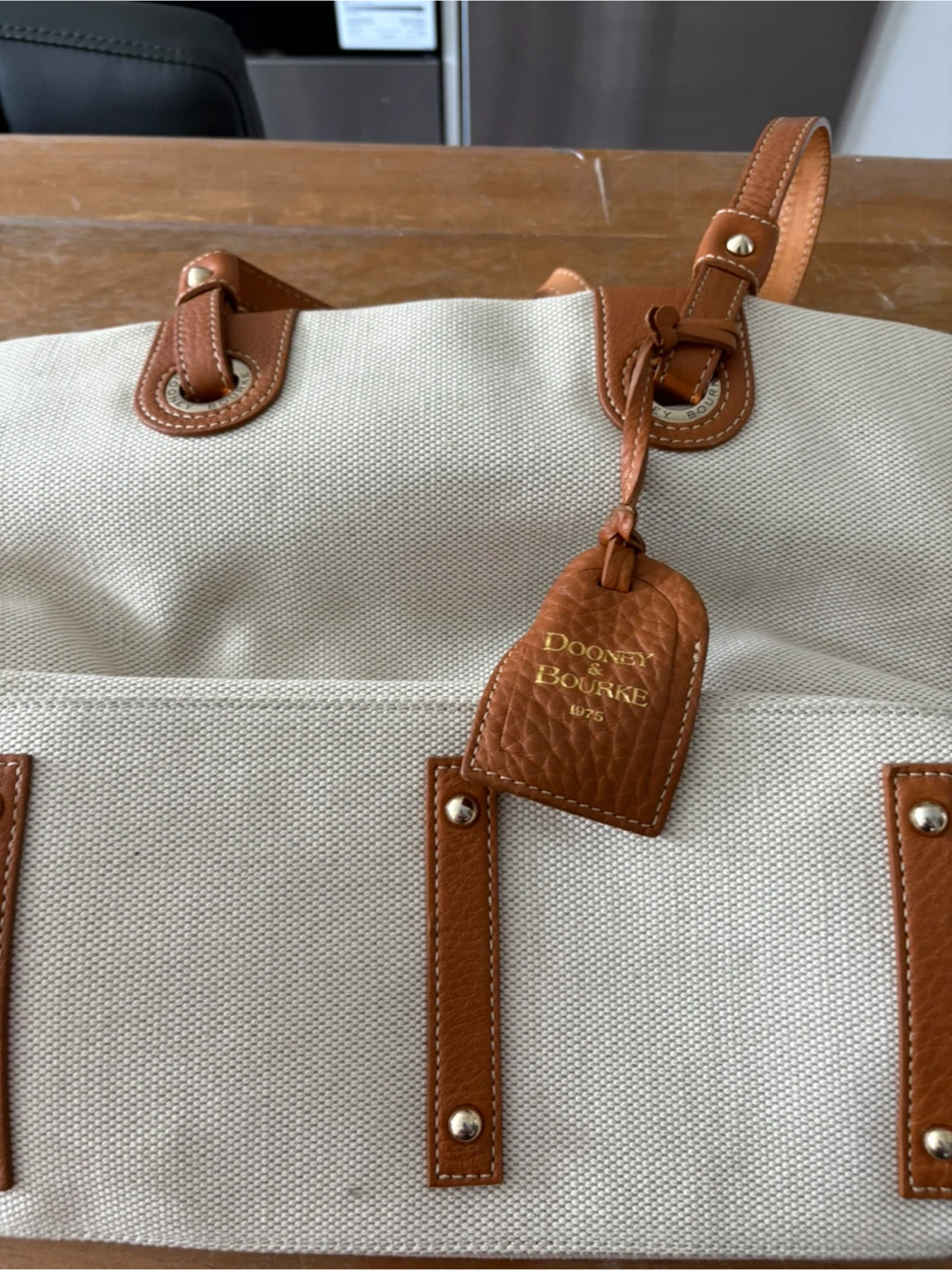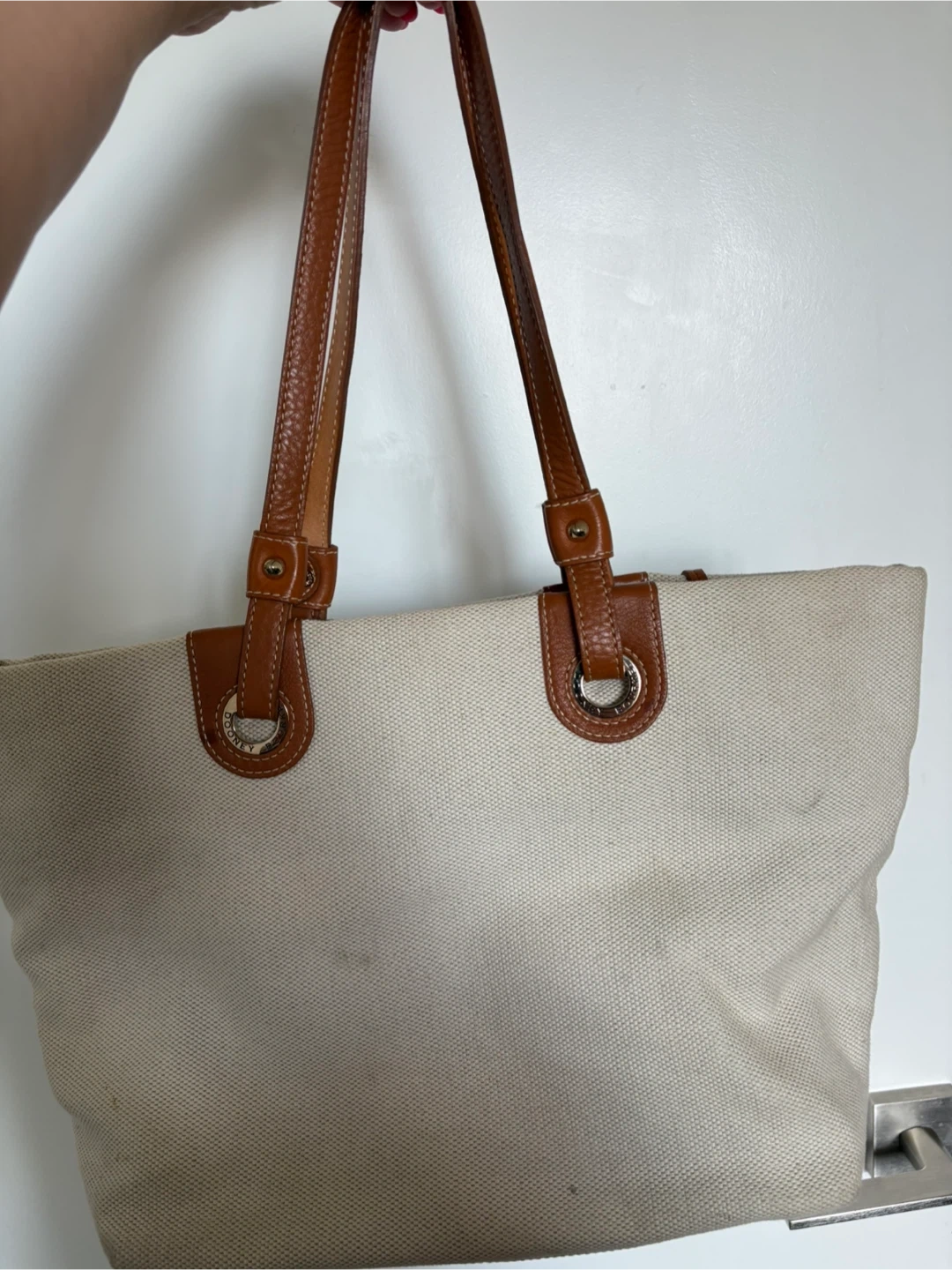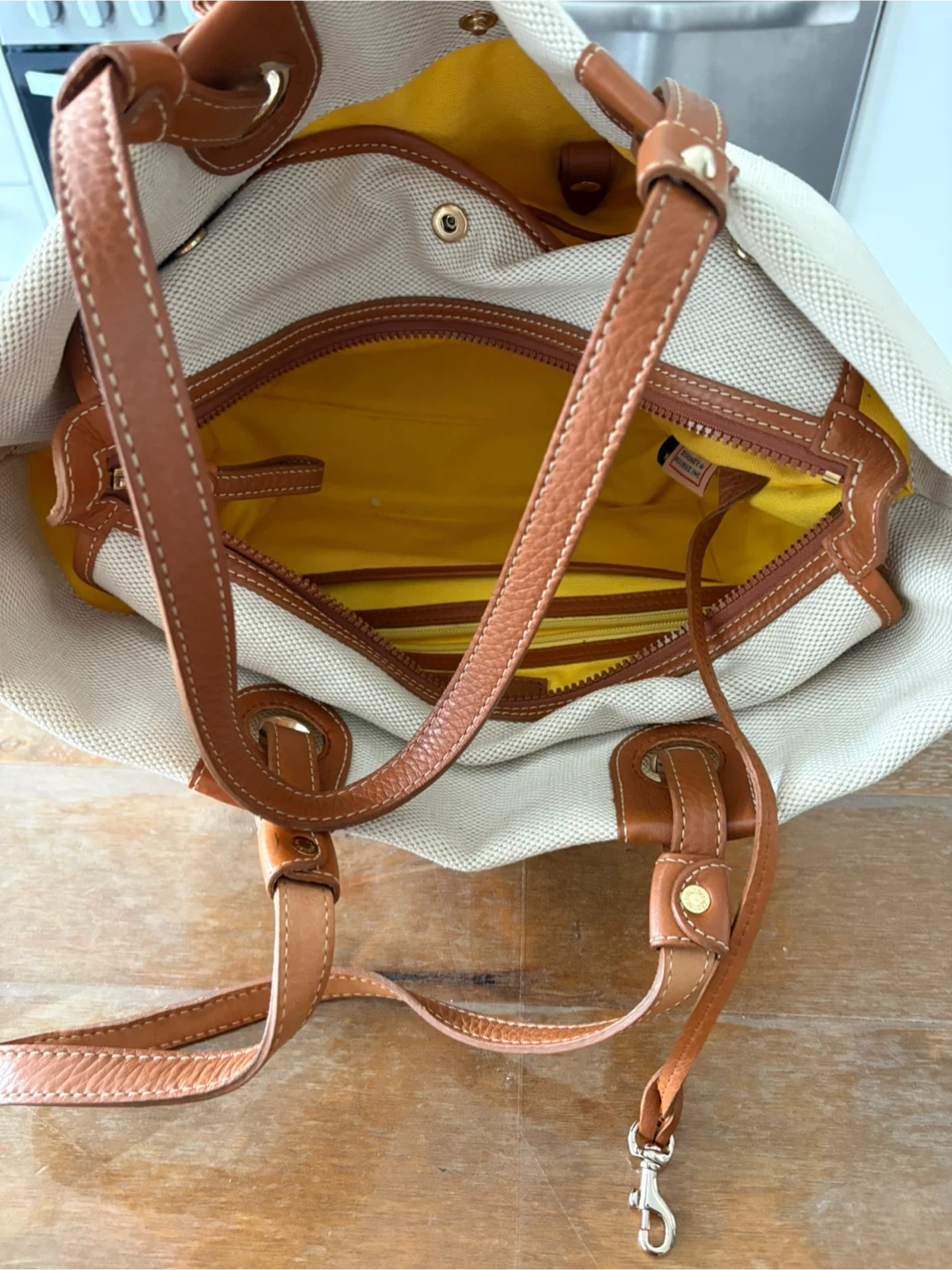 This is a Dooney & Bourke tote bag, perfect for everyday use! It features a beige canvas exterior with brown leather accents and straps. The interior is a bright yellow colour. It's in great condition and ready for a new home!