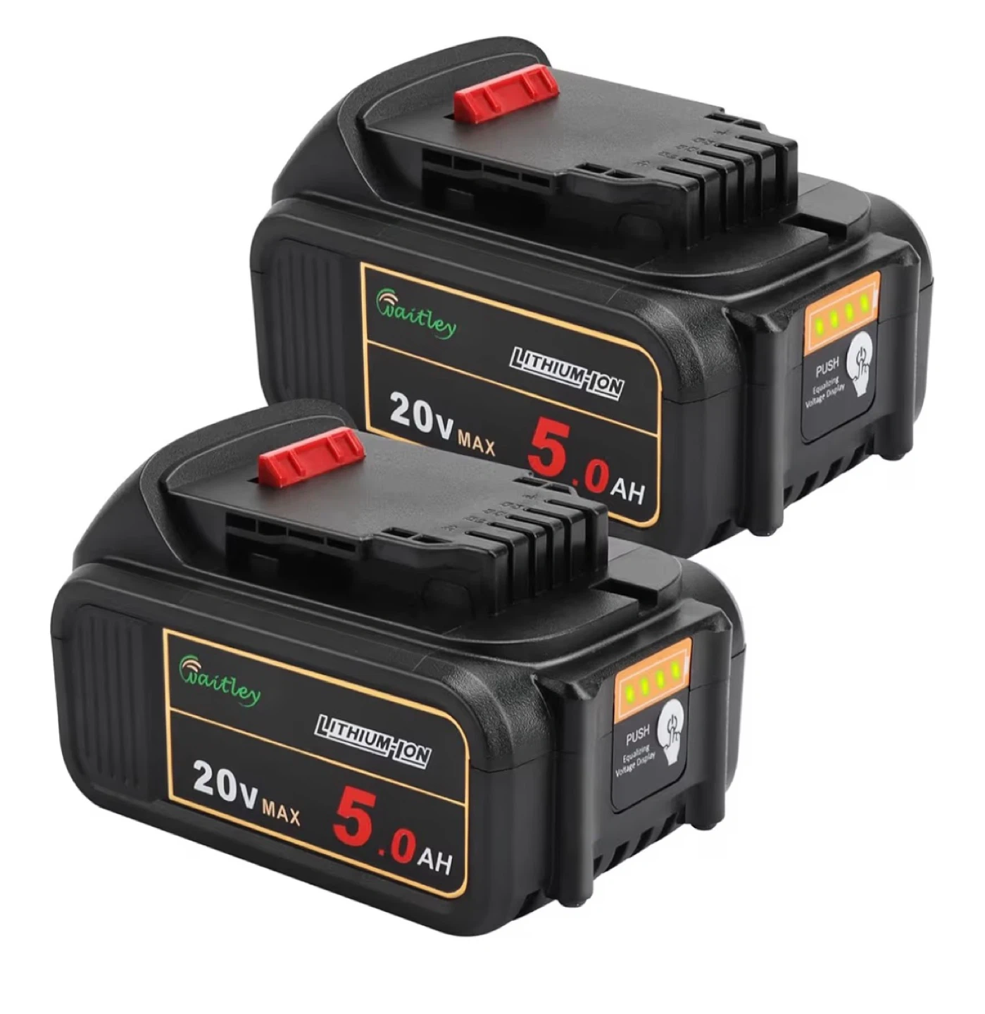 Two Waitley 20V MAX 5.0Ah lithium-ion replacement batteries. These provide 20 volts of power with a 5.0Ah capacity. Includes original box and packaging.