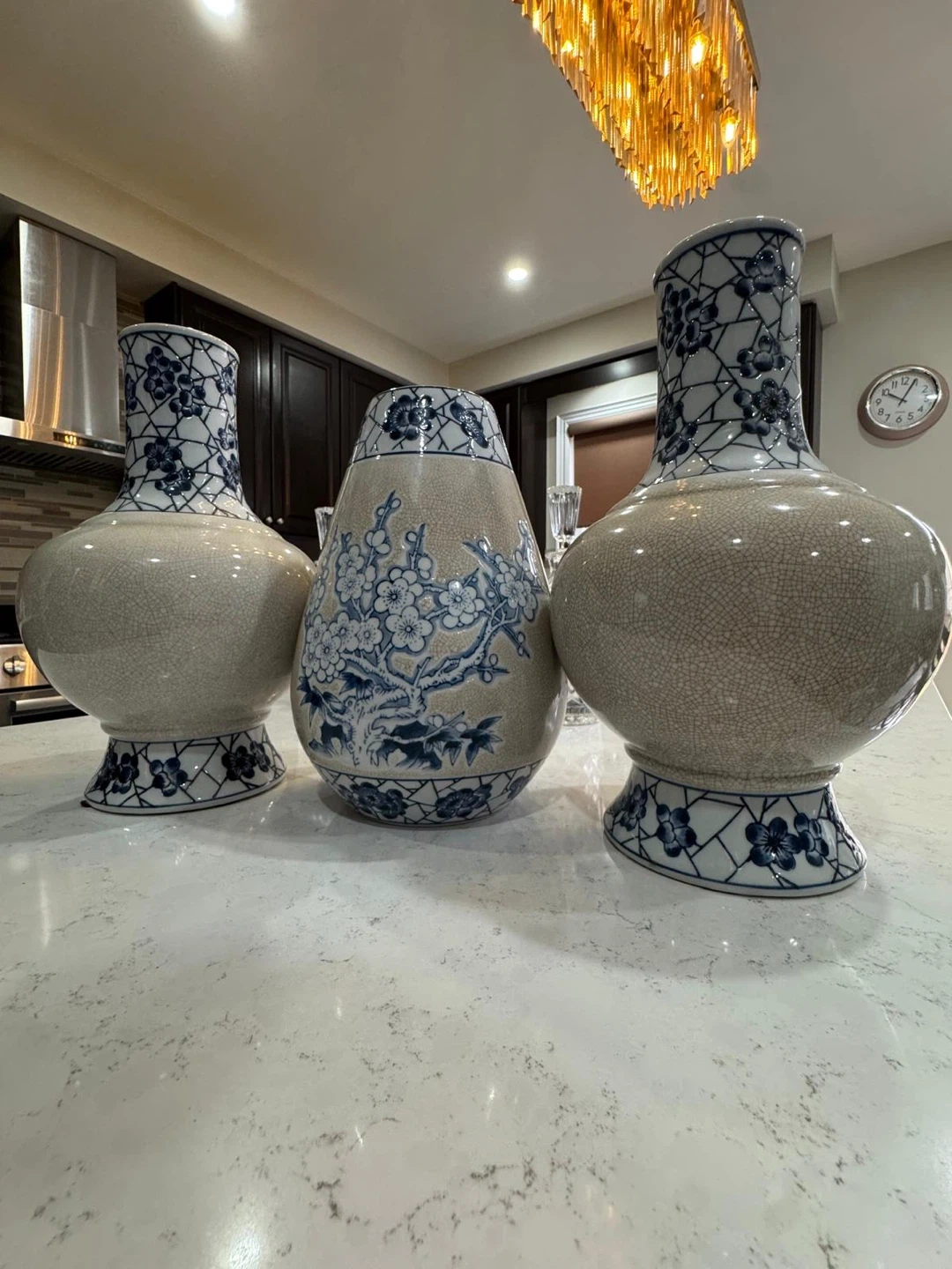 A set of three decorative ceramic vases featuring a blue and white floral pattern. Each vase has a crackle glaze finish. They're perfect for adding a touch of classic style to any room.