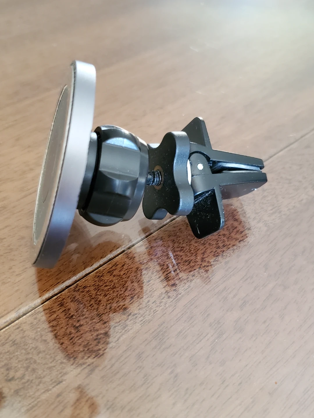 This magnetic car mount securely holds your phone on your car's air vent. It's made with durable metal and plastic components. Simply attach the metal plate to your phone or case, and it'll stick to the mount's magnet. This mount provides easy access to your phone while driving.