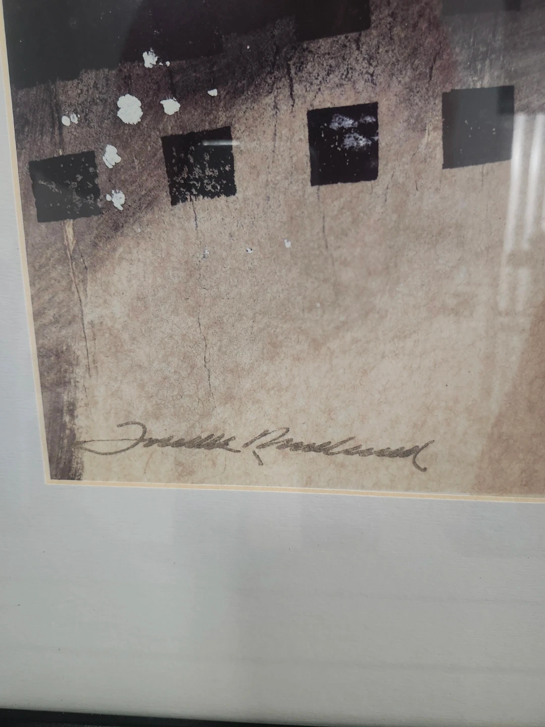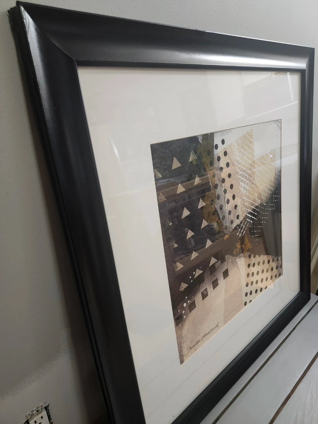 Large Framed abstract art print with a black frame. The artwork features a collage of geometric shapes and textures in black and gold. tones. It's signed by the artist at the bottom. This piece would add a modern touch to any room!