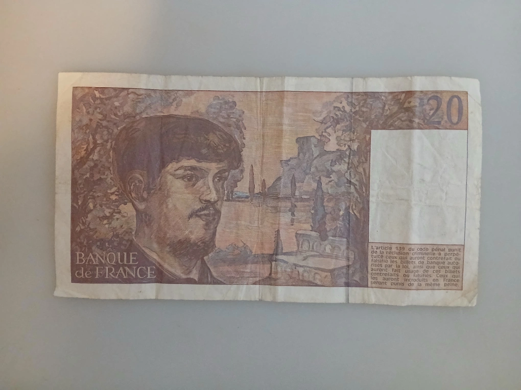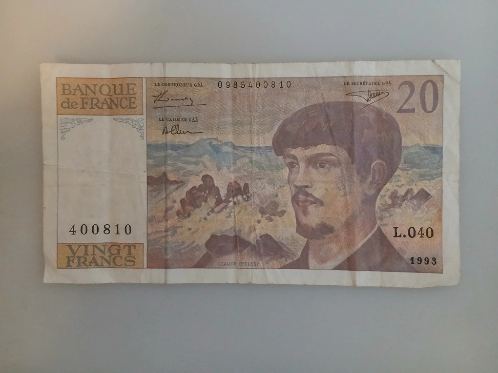 This is a 20 Franc banknote from the Banque de France, featuring a portrait of Claude Debussy. It's dated 1993. The banknote is paper and shows some signs of wear, including creases.