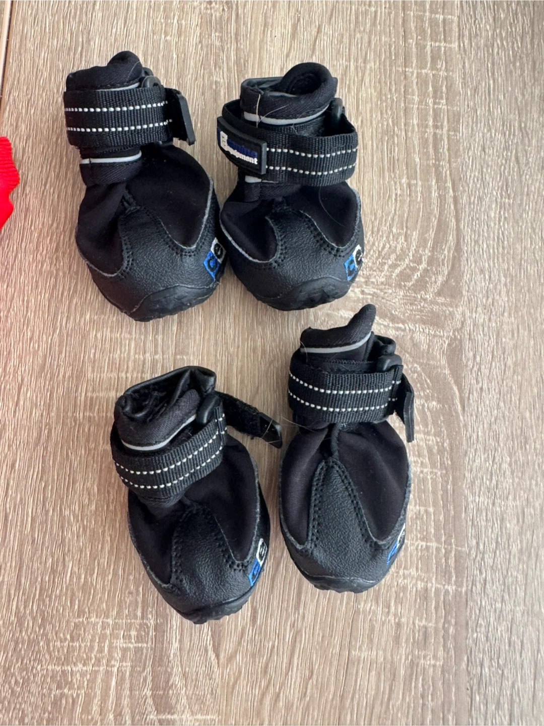 These black Canada Pooch dog boots are a size 4. They feature adjustable velcro straps for a secure fit. They're made with durable material to protect your dog's paws.XS and S