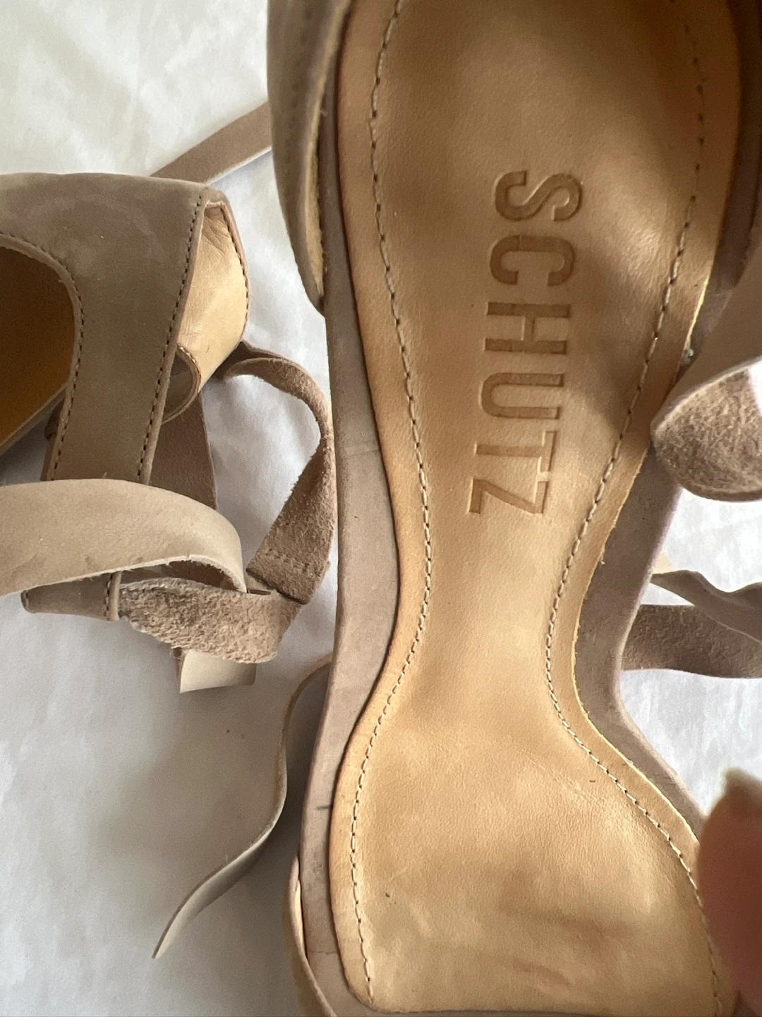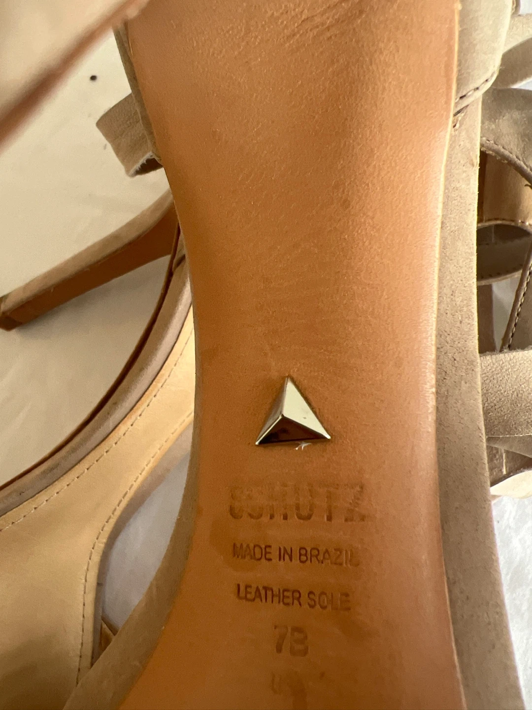 These Schutz heels are made in Brazil and feature a stylish suede exterior. They have a comfortable leather sole and a secure ankle strap closure.