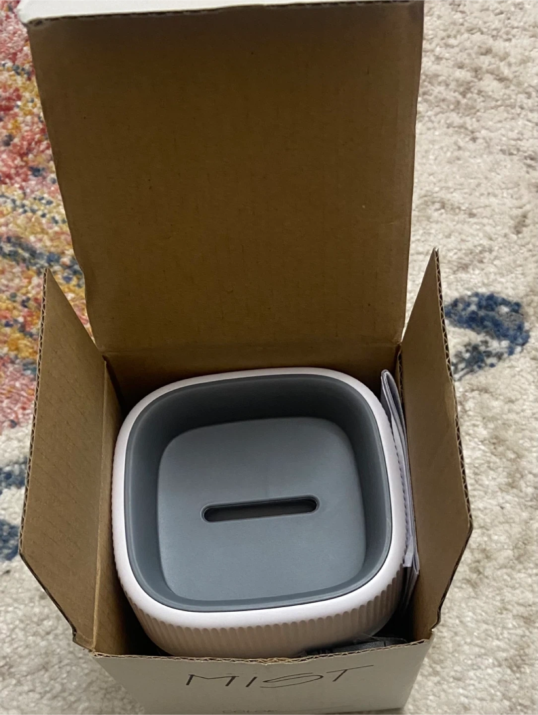 This is a Mist aroma diffuser. It's white and gray with a ribbed texture around the top. Includes original box and manual. Great for creating a relaxing atmosphere!