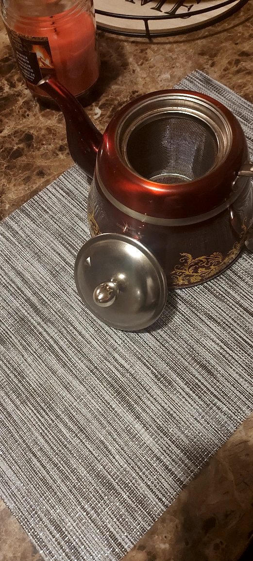 Beautiful teapot, red with gold detailing. Features a built-in infuser. Stainless steel construction. Perfect for tea lovers.