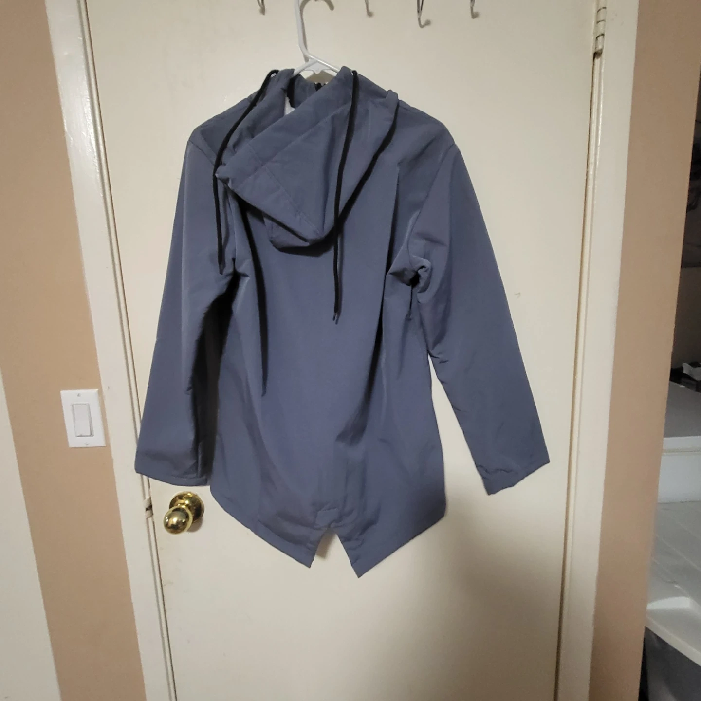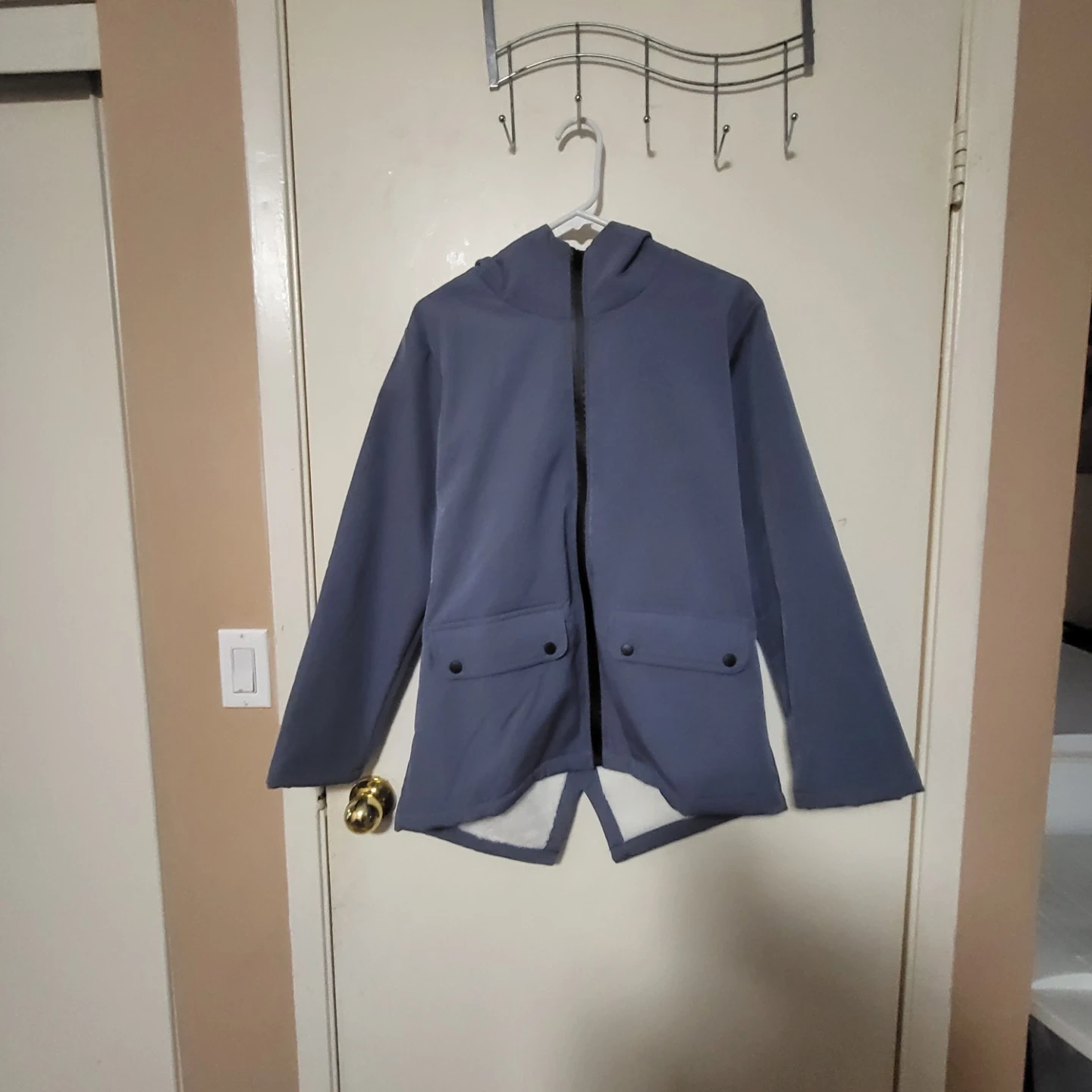 Selling a blue hooded jacket. It's a size small and made of 100% polyester. Wash dark colours separately!