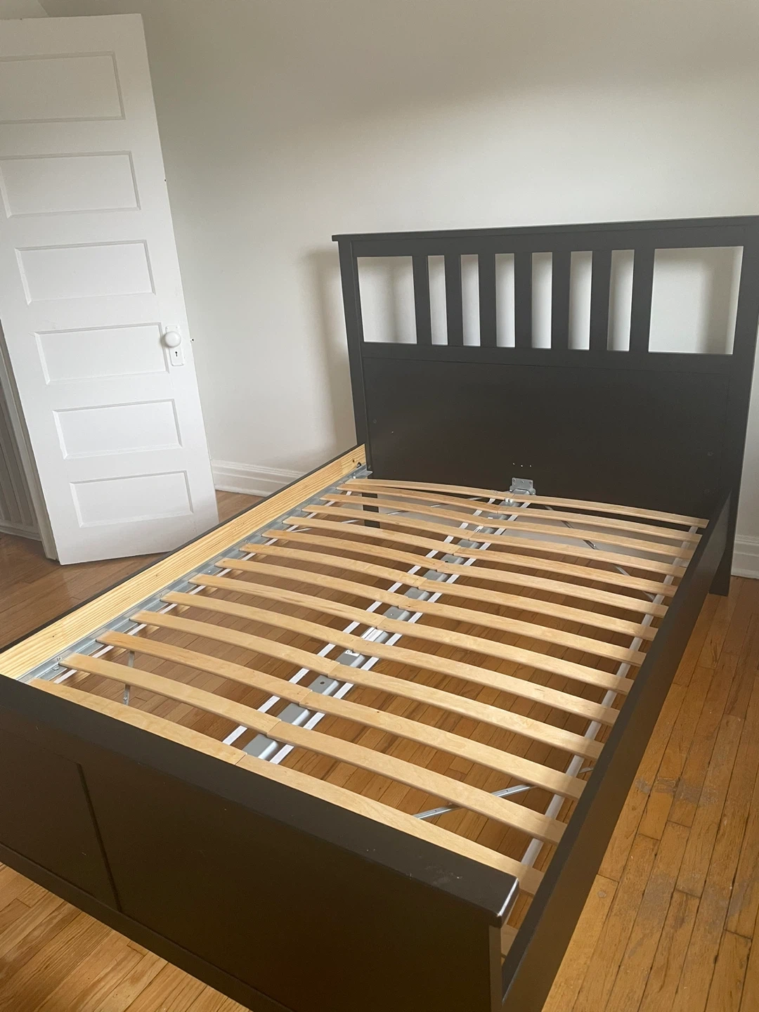 Selling a gently used IKEA Malm bed frame in dark brown. It's in good condition and ready for a new home. Bed has some small scratches on the footer. Please note: the bed will need to be disassembled to bring it downstairs (I live in a two-level apartment, and the bed is currently in the attic). I’m happy to help with disassembly, but would prefer buyers to be present during the process to ensure everything’s okay and no parts are left behind.