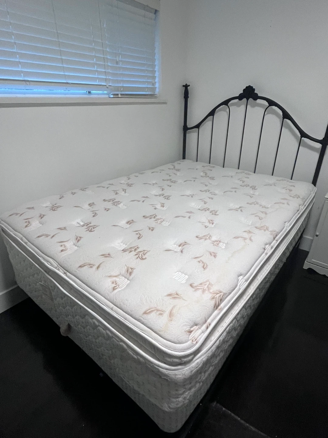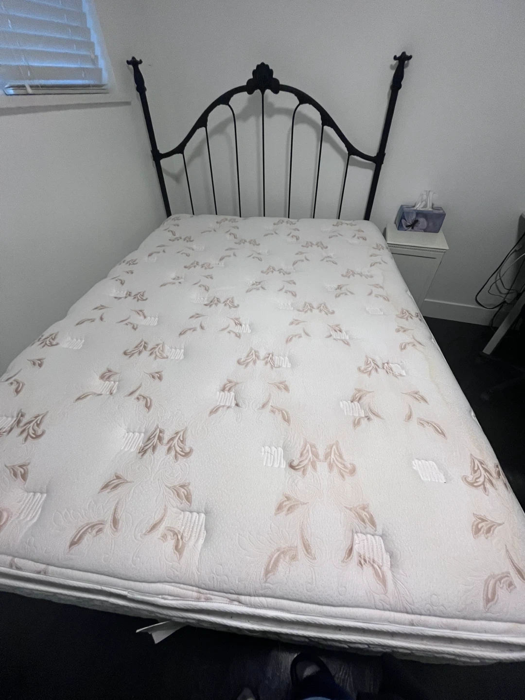 Black metal bed frame. It features a decorative headboard. Perfect for a space to unwind after a long day. Includes, mattress, mattress base, and headboard Blankets, pillows and sheets not included Bed frame dimensions Height 56 inches Width 1.5 inches Length 53.5 inches