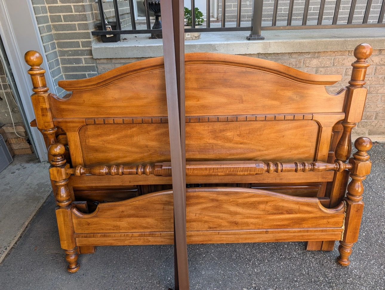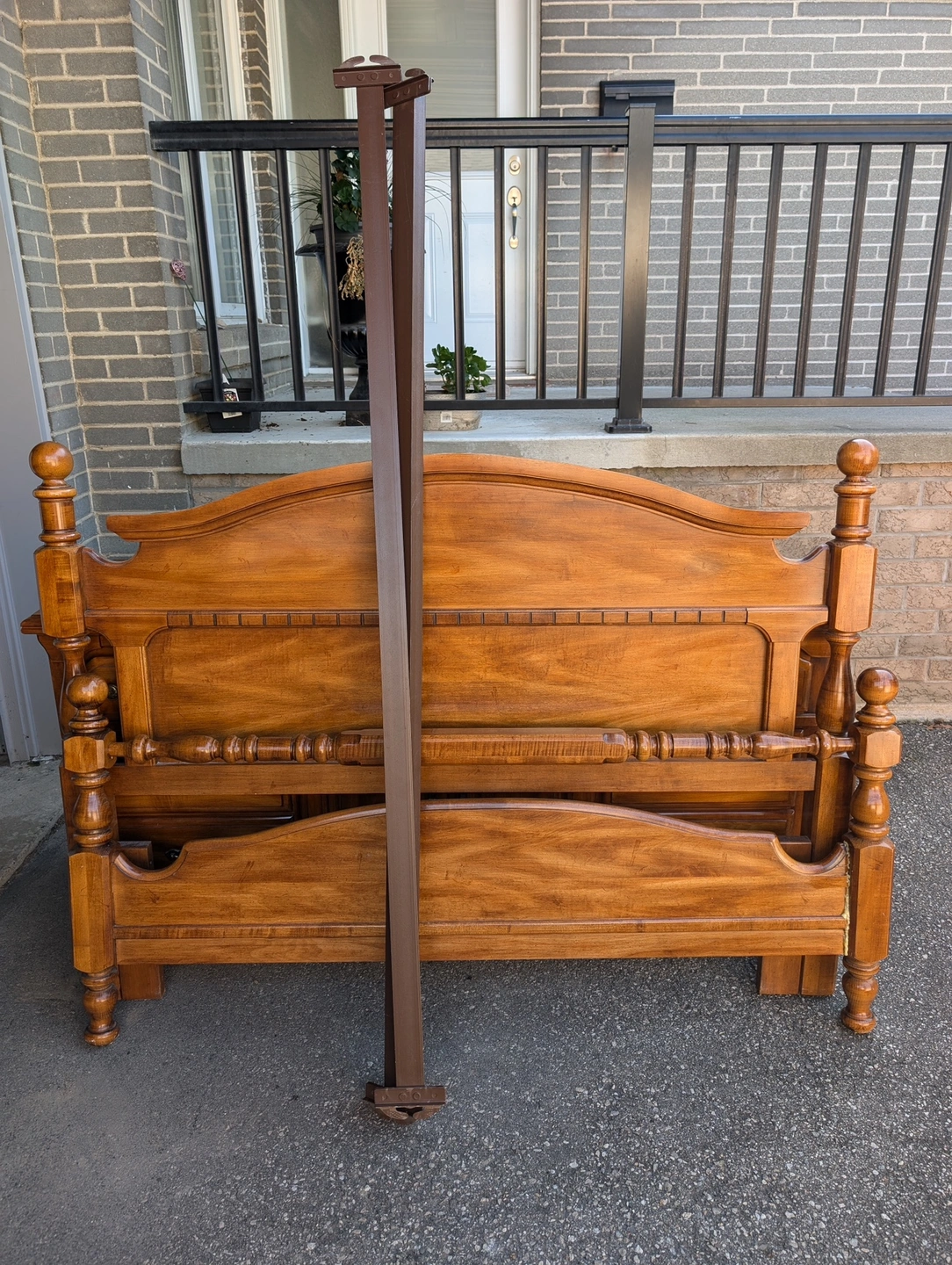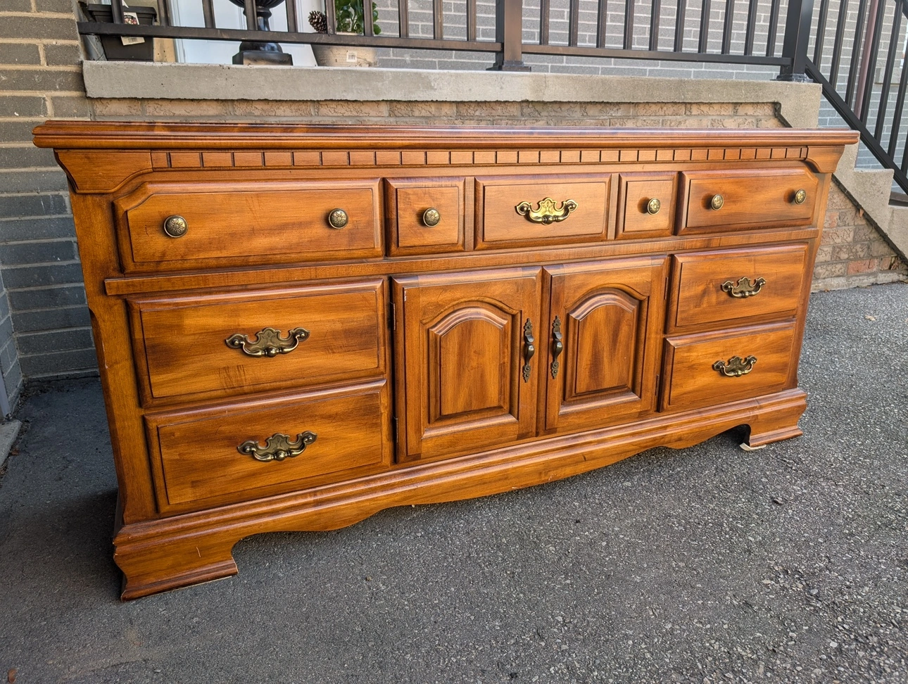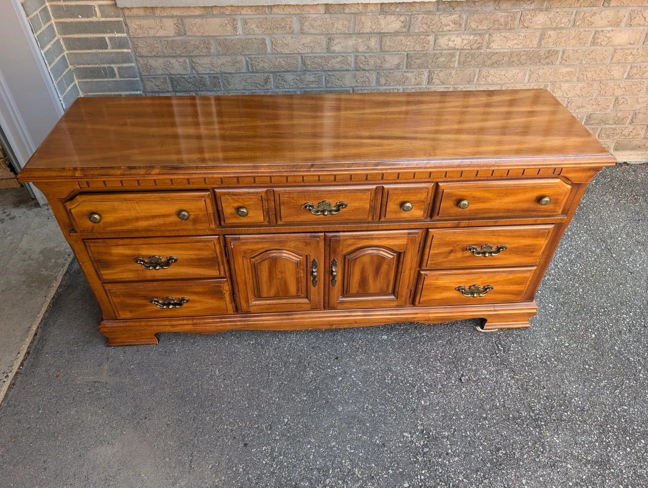Includes headboard, footboard, rails and dresser. The headboard and footboard are made of solid wood with a nice wood grain. The dresser has eight drawers and two cupboards (drawers within). The dresser is quite large with a long surface on the top.