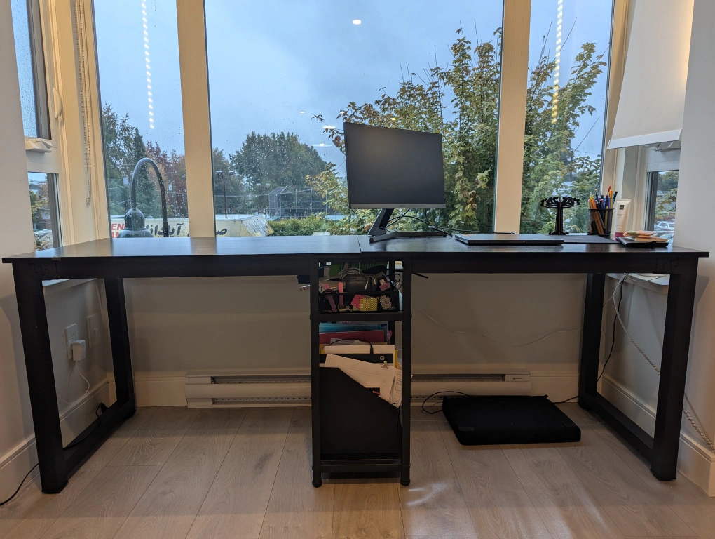 70Selling a black wooden desk that's perfect for a home office or study space! It features a built-in shelf for extra storage. The desk measures 78.74" wide, 23.62" deep, and 28.74" tall. The shelf is 20.07" wide and 11.81" deep. Important: There are only two minor signs of wear, as shown in the pictures. Other than that, it’s in excellent condition, and all screws are included — nothing is missing. The desk has been disassembled to make transportation easier.