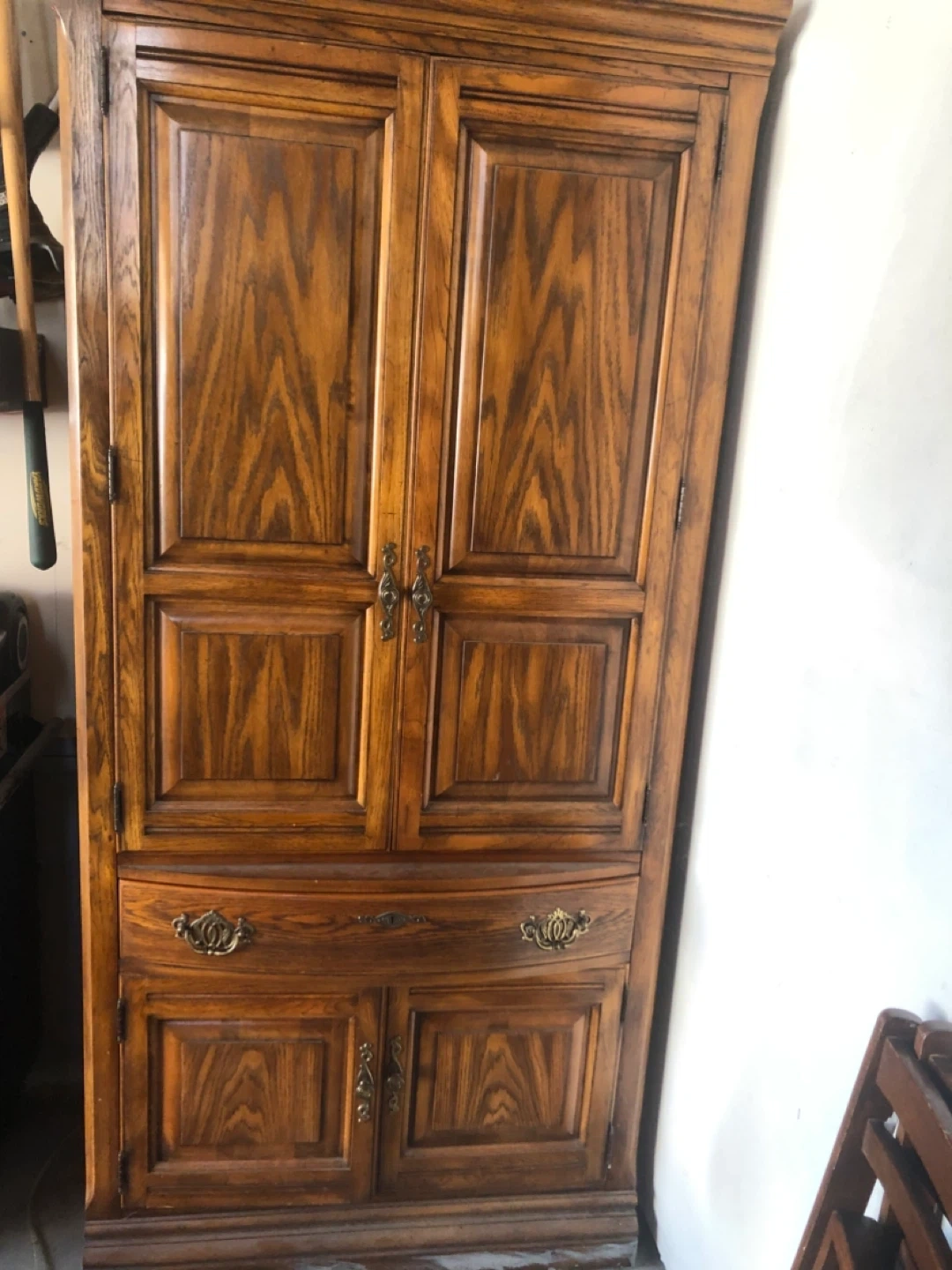 This is a beautiful vintage wooden armoire with classic detailing. It features paneled doors and drawers with ornate hardware. Inside, there are adjustable shelves and ample storage space. It's perfect for storing clothes, linens, or household items and would make a great addition to any room!